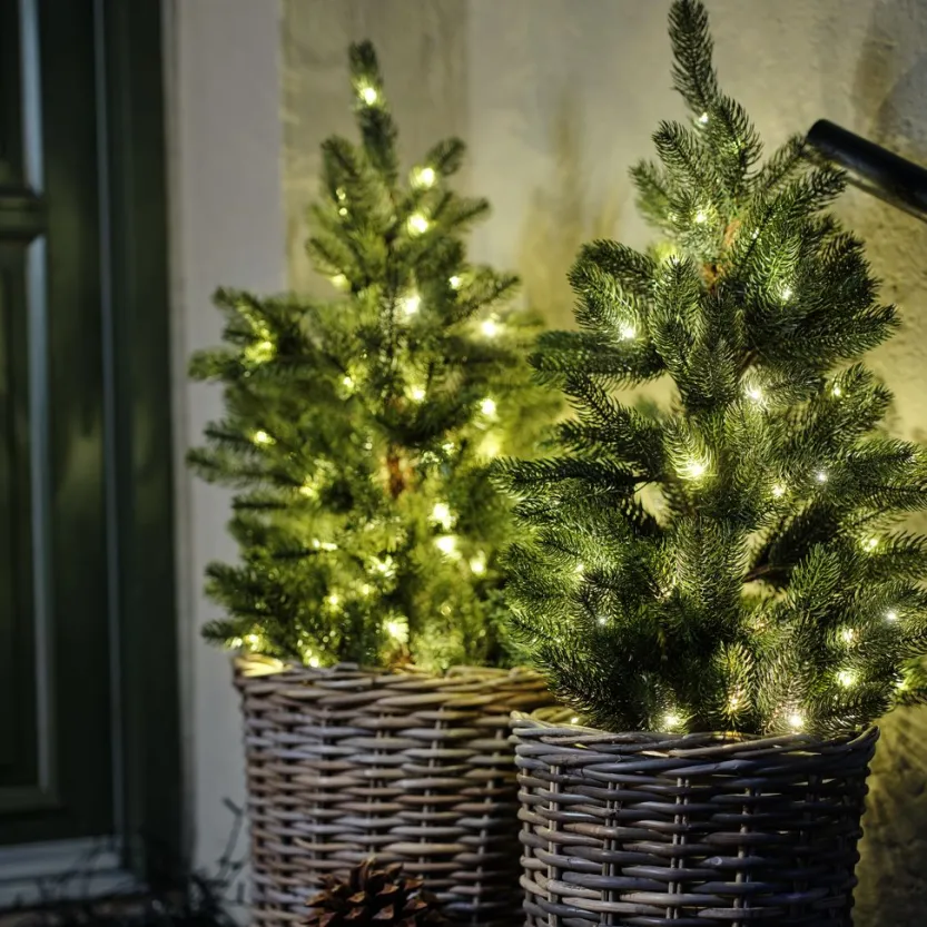 Kunstkerstboom met ingebouwde LED-verlichting. Deze groene boom wordt geleverd in een zwarte pot en heeft een natuurlijke uitstraling met fijne takken en naalden. De 60 LED-lampjes verspreiden een warm licht van 2600 K, waardoor een gezellige sfeer wordt gecreëerd. De boom is voorzien van een timerfunctie en werkt op 3 AA-batterijen (niet inbegrepen). Ideaal voor zowel binnenshuis als buitenshuis. 45×90 cm
