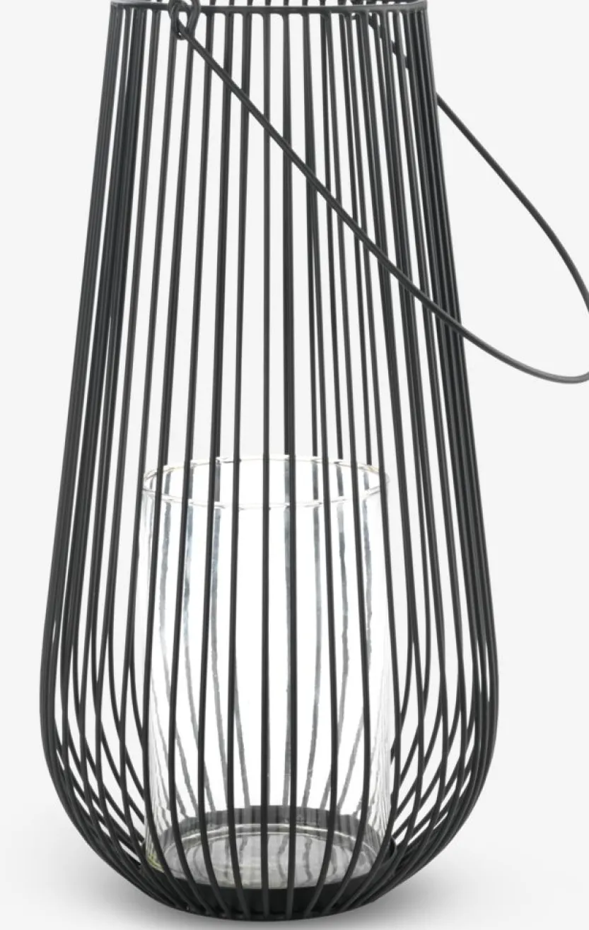 Zwarte lantaarn gemaakt van staal en glas met een strak, modern ontwerp. Het stalen frame heeft een open draadstructuur waardoor het licht sfeervol kan schijnen. De lantaarn is voorzien van een glazen houder, perfect voor het plaatsen van kaarsen. Ø24 x H46 cm.