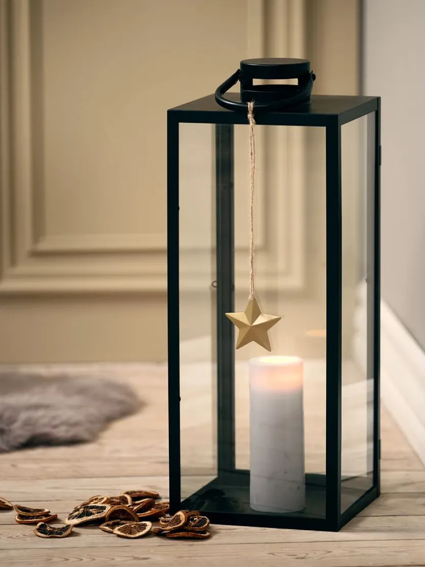 Zwarte lantaarn gemaakt van staal en glas, afgewerkt met een handvat van jute. Deze stijlvolle lantaarn is ideaal voor het creëren van een warme en gezellige sfeer in huis. Het minimalistische ontwerp met strakke lijnen past perfect bij elke interieurstijl. De glazen panelen zorgen voor een mooie verspreiding van het kaarslicht, terwijl de stevige stalen constructie zorgt voor duurzaamheid en stabiliteit. De lantaarn is voorzien van een handig handvat, waardoor deze gemakkelijk te verplaatsen is. B21 x L21 x H54 cm