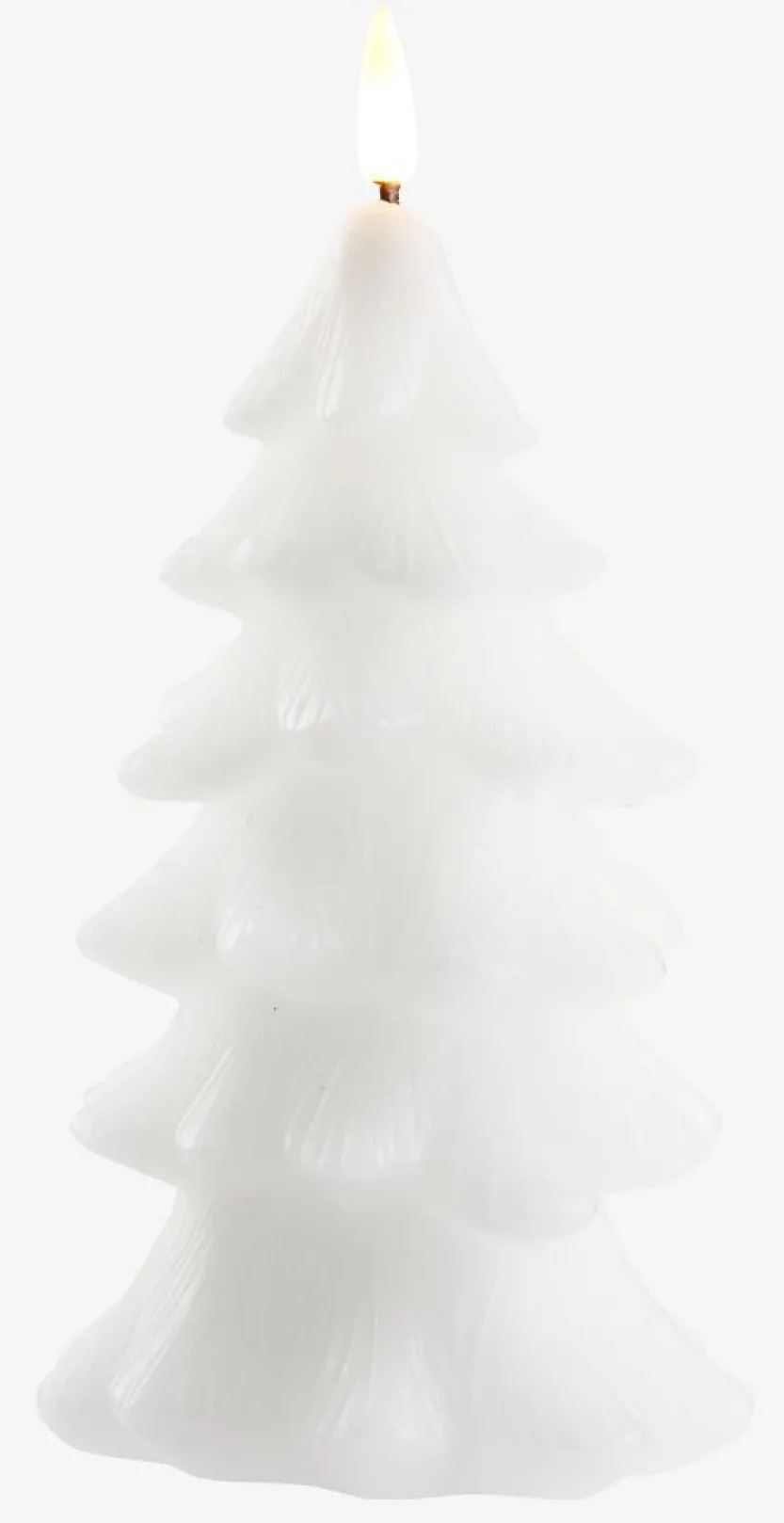 Witte LED kaars in de vorm van een kerstboom. Deze sfeervolle kaars heeft een ingebouwde LED met een warme lichtkleur van 2700 K en een brandduur van 20000 uren. De kaars werkt op batterijen (2x AA, exclusief) en heeft een handige timerfunctie. Perfect voor binnengebruik tijdens de feestdagen. Ø9 x H20 cm.