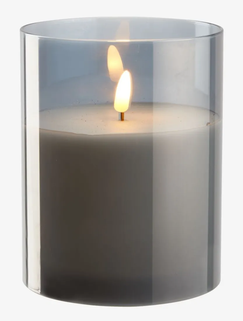 Grijze LED kaars in een cilindervormig ontwerp. Voorzien van een timerfunctie voor eenvoudig gebruik en een realistische vlam voor een sfeervolle uitstraling. Perfect voor het creëren van een warme en gezellige sfeer in huis. Werkt op 2 AA-batterijen (niet inbegrepen). Ø12 x H15 cm.