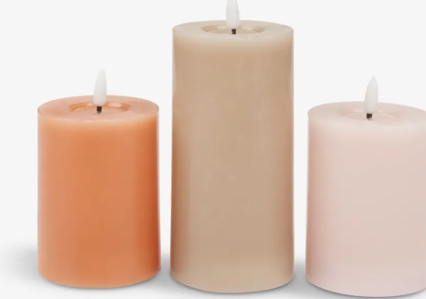 Set van drie led kaarsen in kaki, oranje en roze. De kaarsen hebben een timerfunctie en bieden een warme gloed dankzij de ingebouwde LED-verlichting. Perfect voor sfeervolle decoratie binnenshuis. Werkt op batterijen (exclusief). Ø8 x H13 / 15 / 18 cm.