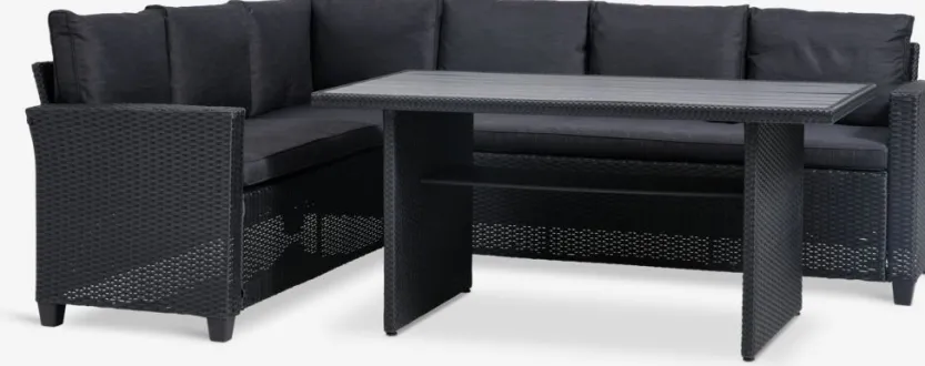 Tafel: Staal, kunsthout en polyrotan. B74 x L144 x H67 cm. 6-zitsbank: Staal en polyrotan. Kan niet gespiegeld worden. Incl. luxe kussens met duurzame, structuurgeweven hoes.