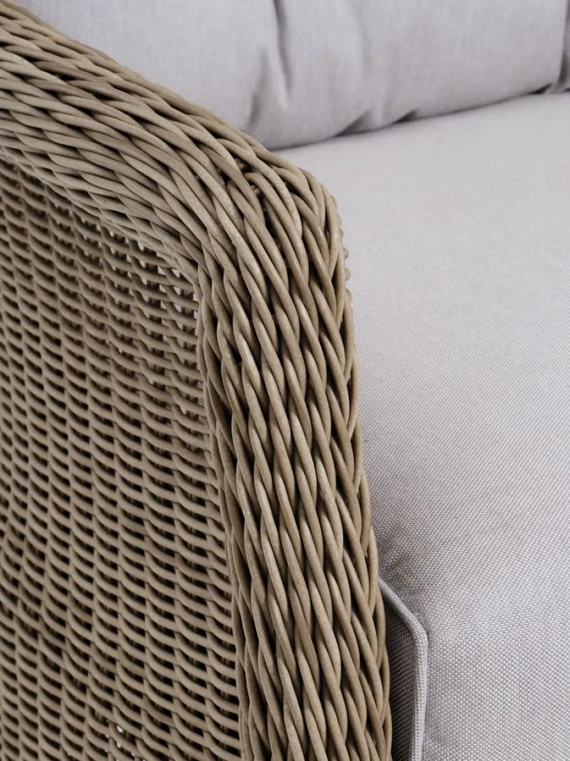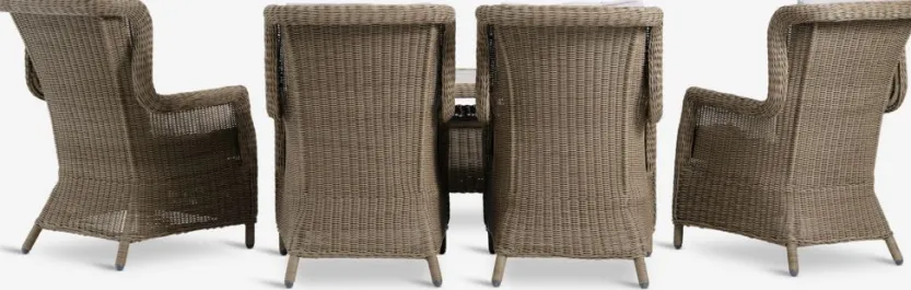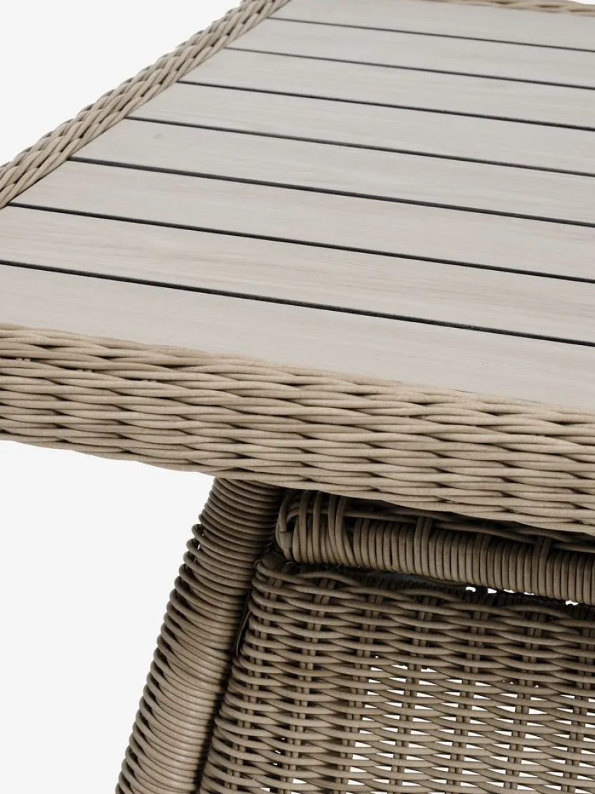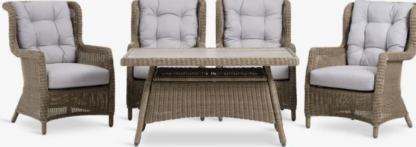 4-zits loungeset. Tafel: Aluminium, DURAWOOD® composiethout en polyrotan. DURAWOOD® is een duurzaam composietmateriaal dat bestaat uit FSC® hardhoutvezels en kunststof. B84 x L127 x H65 cm. Stoel: Aluminium en polyrotan. Incl. luxe kussens met duurzame, structuurgeweven hoes.