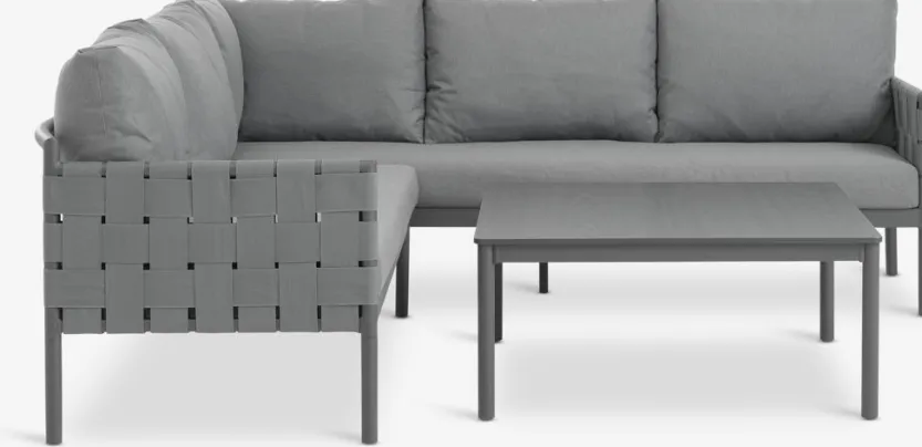 5-zits loungeset. Tafel: Aluminium en DURAWOOD® composiethout. DURAWOOD® is een duurzaam composietmateriaal dat bestaat uit FSC® hardhoutvezels en kunststof. B86 x L86 x H39 cm. 5-zitsbank: Aluminium en UV-beschermd polypropyleen. Kan niet worden gespiegeld. Incl. luxe kussens met duurzame, structuurgeweven hoes.
