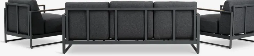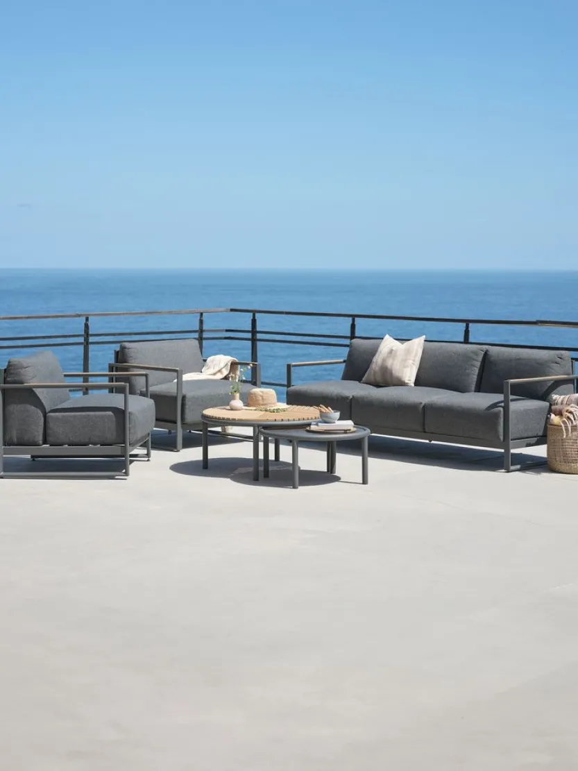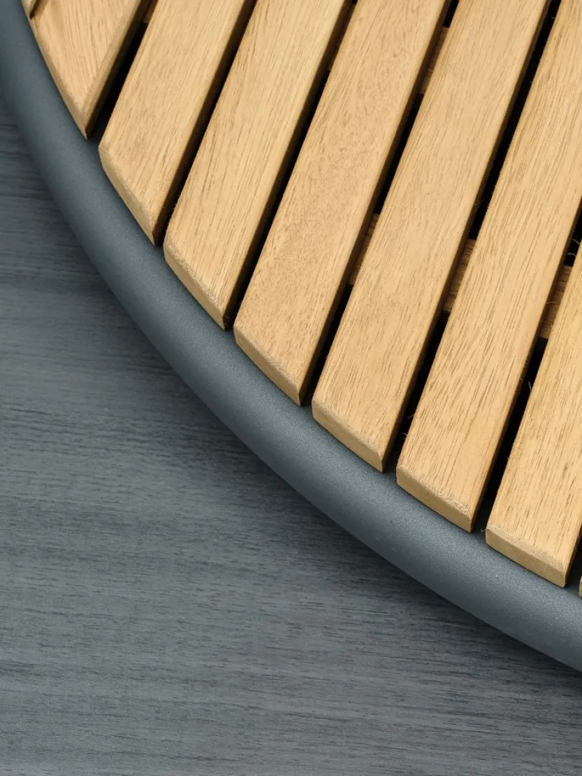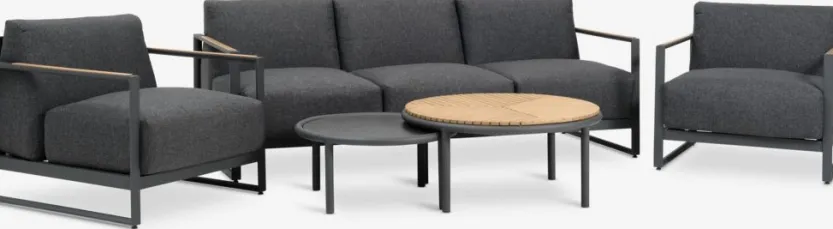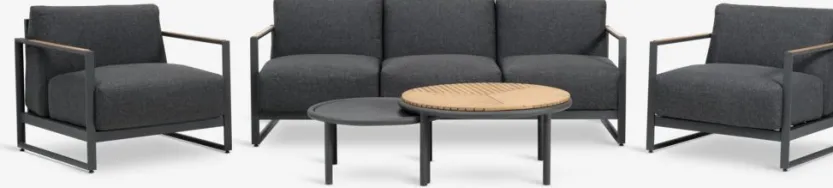 5-zits loungeset. Tafel: Aluminium, DURAWOOD® composiethout en gelakt FSC® hardhout. DURAWOOD® is een duurzaam composietmateriaal dat bestaat uit FSC® hardhoutvezel en kunststof. Ø83/67 x H38/32 cm. 3-zitsbank en stoel: Aluminium en gelakt FSC® hardhout. Incl. zeer dikke luxe kussens met duurzame, structuurgeweven hoes.
