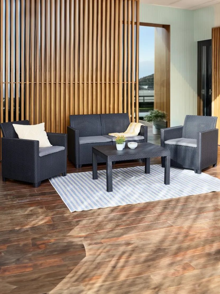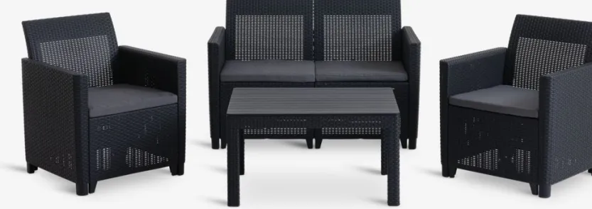 4-zits loungeset. Tafel: UV-beschermd kunststof (75% gerecycled). B78 x L59 x H43 cm. 2-zitsbank en stoel: UV-beschermd kunststof (75% gerecycled). Incl. kussens.