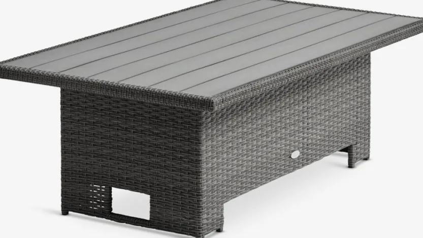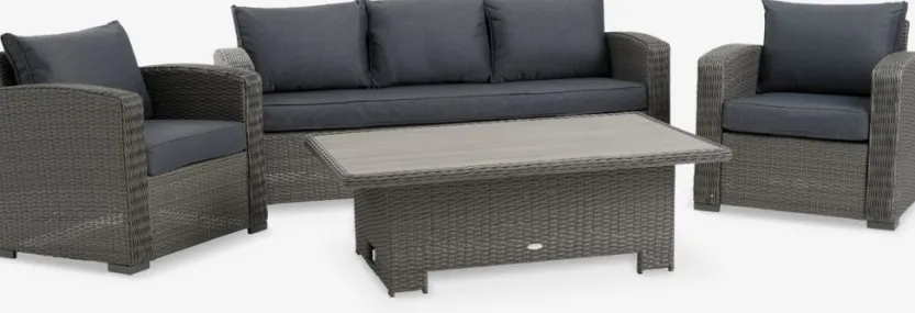 5-zits loungeset. Tafel: Aluminium, kunsthout en polyrotan. In hoogte verstelbaar. B85 x L134 x H45/68 cm. 3-zitsbank en stoel: aluminium en polyrotan. Incl. luxe kussens met een duurzaam, structuurgeweven hoes.