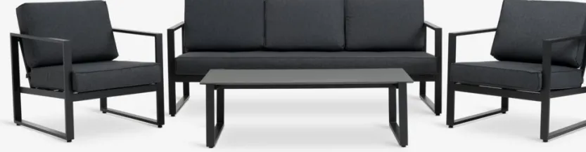 Tafel: aluminium en vezelcement. B64 x L129 x H40 cm. 3-zitsbank en stoelen: aluminium. Incl. luxe kussens met een duurzaam, structuurgeweven hoes.
