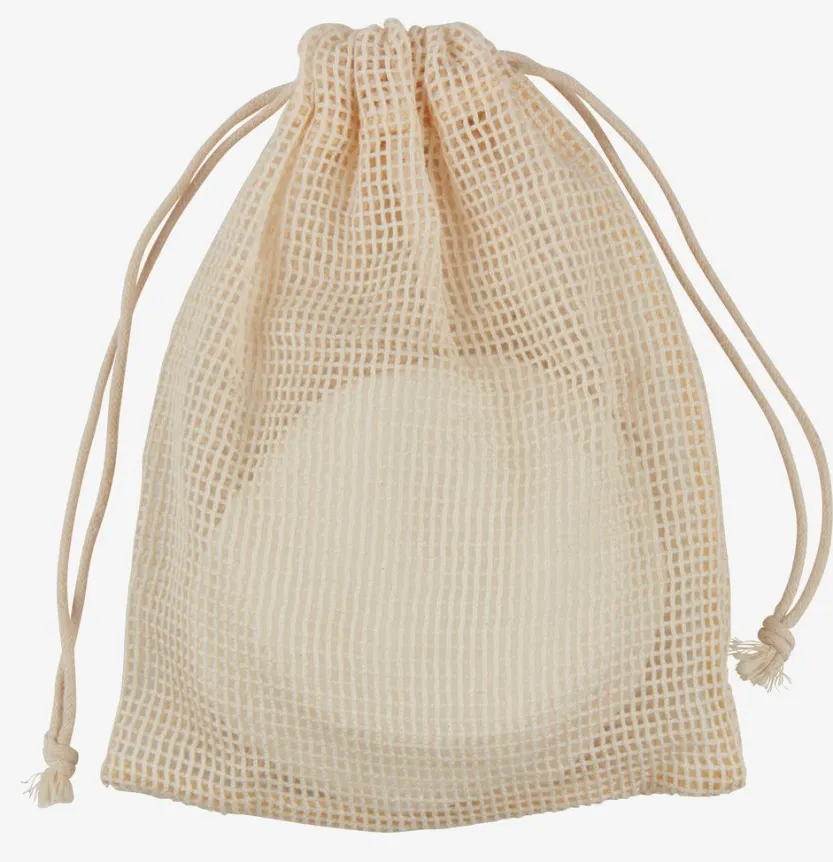 Herbruikbare make-up pads van 70% bamboe/30% katoen. Incl. 100% katoenen waszak. Wasbaar op 60°C. Verpakt per 10. Ø8 cm