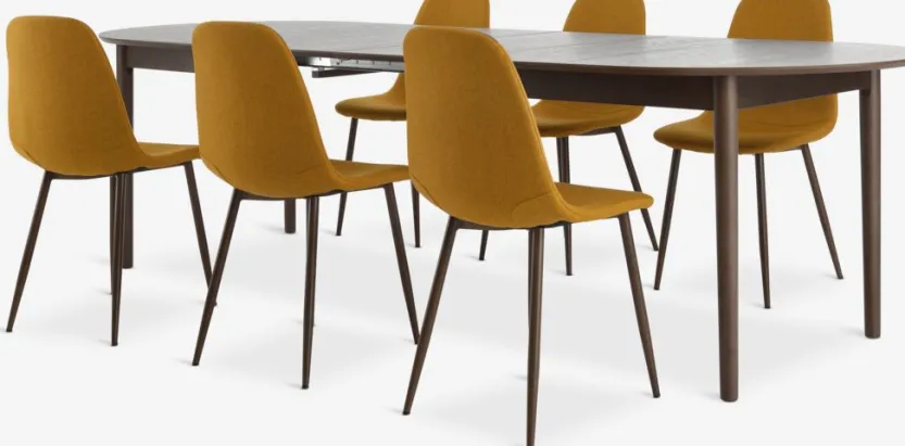 Tafel: Massief hout en eiken fineer. Incl. 2 verlengbladen, die onder het tafelblad kunnen worden opgeborgen. B100 x L200/240/280 x H75 cm. Stoel: Stof en staal.
