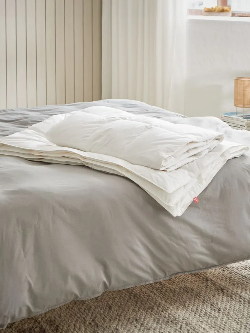 Allergievriendelijk muskusdonzen dekbed 135×200 cm met 90% witte Europese muskusdons/10% muskusveren, 240 g. Muskusdons lijkt op het exclusieve eiderdons en zorgt voor uitzonderlijke isolatie. Zachte tijk van 100% cambric katoen. De dichtgeweven tijk helpt het binnendringen van huisstofmijt te verminderen. Doorgestikte vierkante constructie voor een gelijkmatige verdeling van de vulling. Vulkracht 725. Wasbaar op 60°C. Incl. opbergtas.