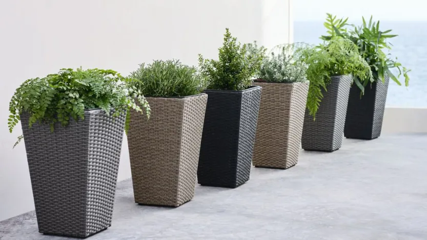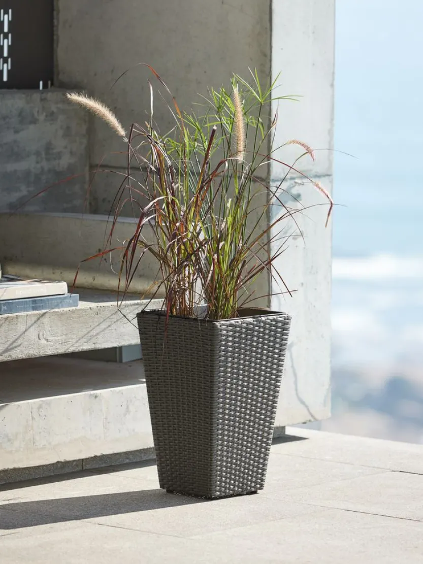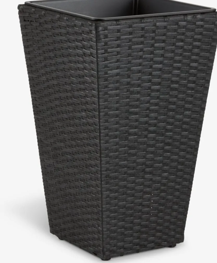 Zwarte plantenbak van polyrotan en gepoedercoat staal. Deze lichtgewicht, vorstbestendige plantenbak is ideaal voor het tentoonstellen van allerlei soorten planten in buitenruimtes. Een afvoergat kan eenvoudig worden gemaakt om ervoor te zorgen dat overtollig water kan weglopen. B31 x L31 x H50 cm