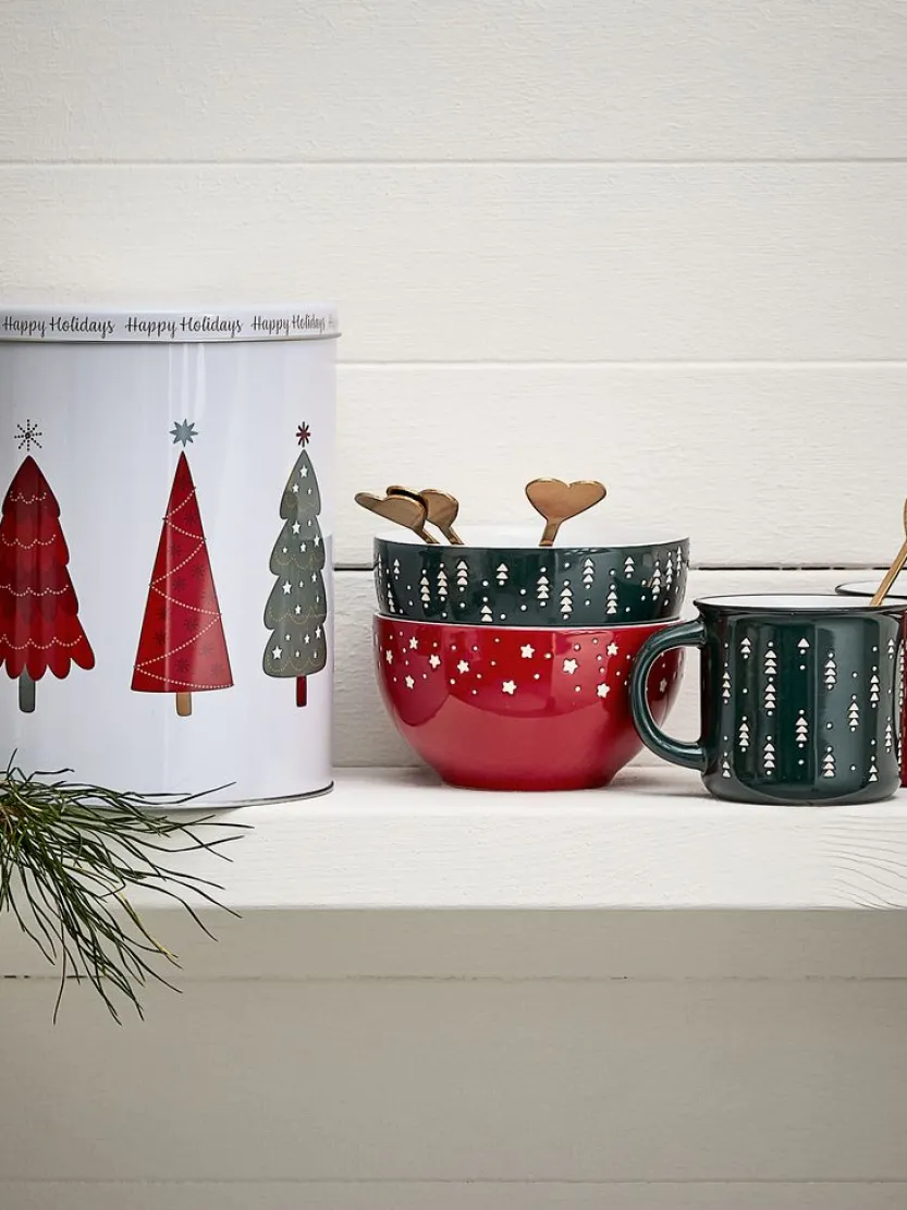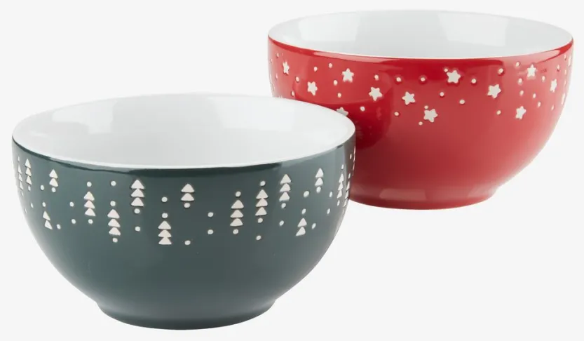 Set van twee kerstschalen in de kleuren groen en rood. Elke schaal is versierd met feestelijke patronen van kerstbomen en sterren, wat een gezellige kerstsfeer aan uw tafelsetting toevoegt. Ideaal voor het serveren van diverse gerechten en lekkernijen tijdens de feestdagen. Ø14 x H7 x L650ml cm