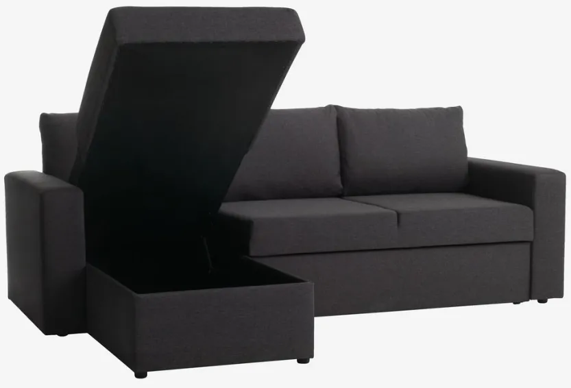 3-zitsbank in stof. Zit- en rugkussens in schuim. Poten van massief berken. Met opbergruimte. Kan worden gespiegeld. Afmeting bed 140×195 cm. B230 x H83 x D88/150 cm