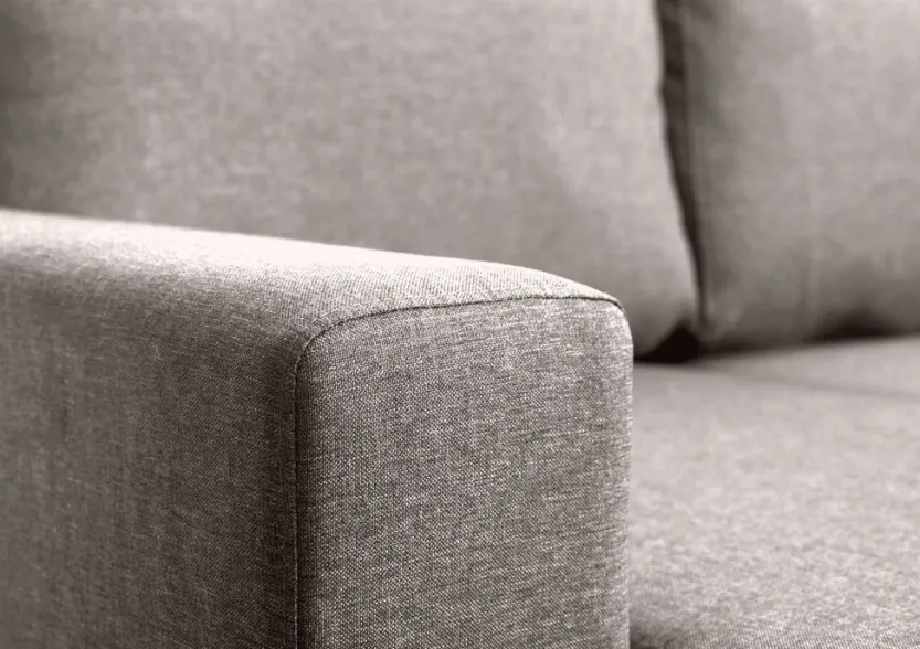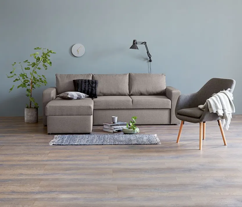 3-zitsbank in stof. De bank is gemakkelijk te veranderen in een bed. Zit- en rugkussens van schuim. Poten van massief berken. Met opbergruimte. Kan worden gespiegeld. Afmeting bed: 140×195 cm. B230 x H83 x D88/150 cm.