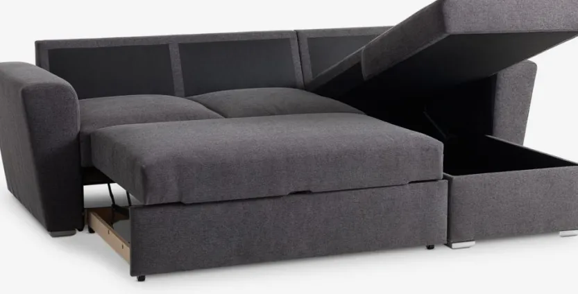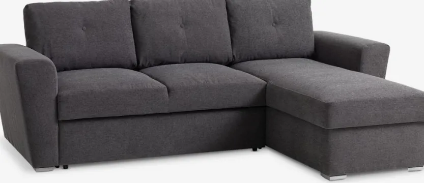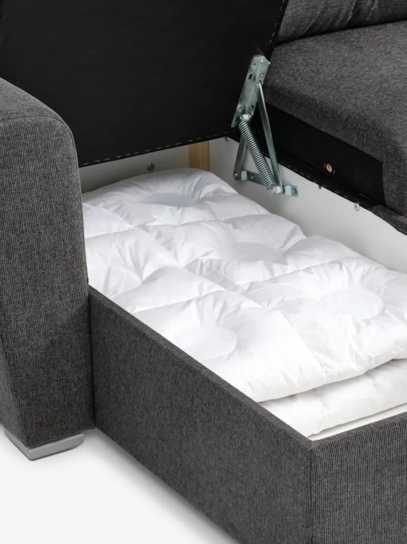3-zitsbank van stof. De bank is eenvoudig om te vormen tot een bed. Zitkussen met bonellveren en schuimvulling. Rugkussen in schuim. Met opbergruimte. Kan worden gespiegeld. Slaapgedeelte 145×195 cm. B243 x H86 x D86/156 cm
