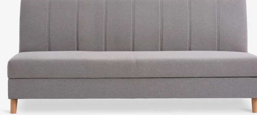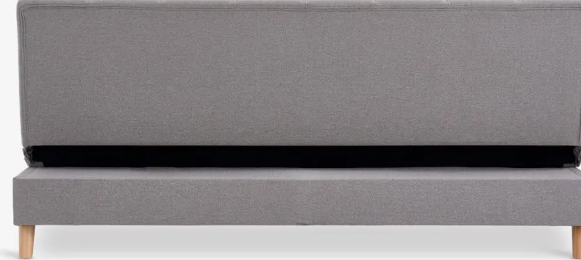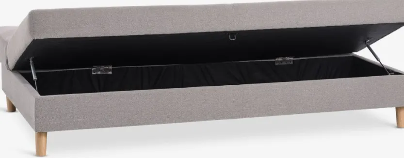 3-zitsbank van stof. Zit- en rugkussens in schuim. Poten van massief hout. Met opbergruimte. Afm. bed 114×192 cm. B192 x H85 x D97 cm