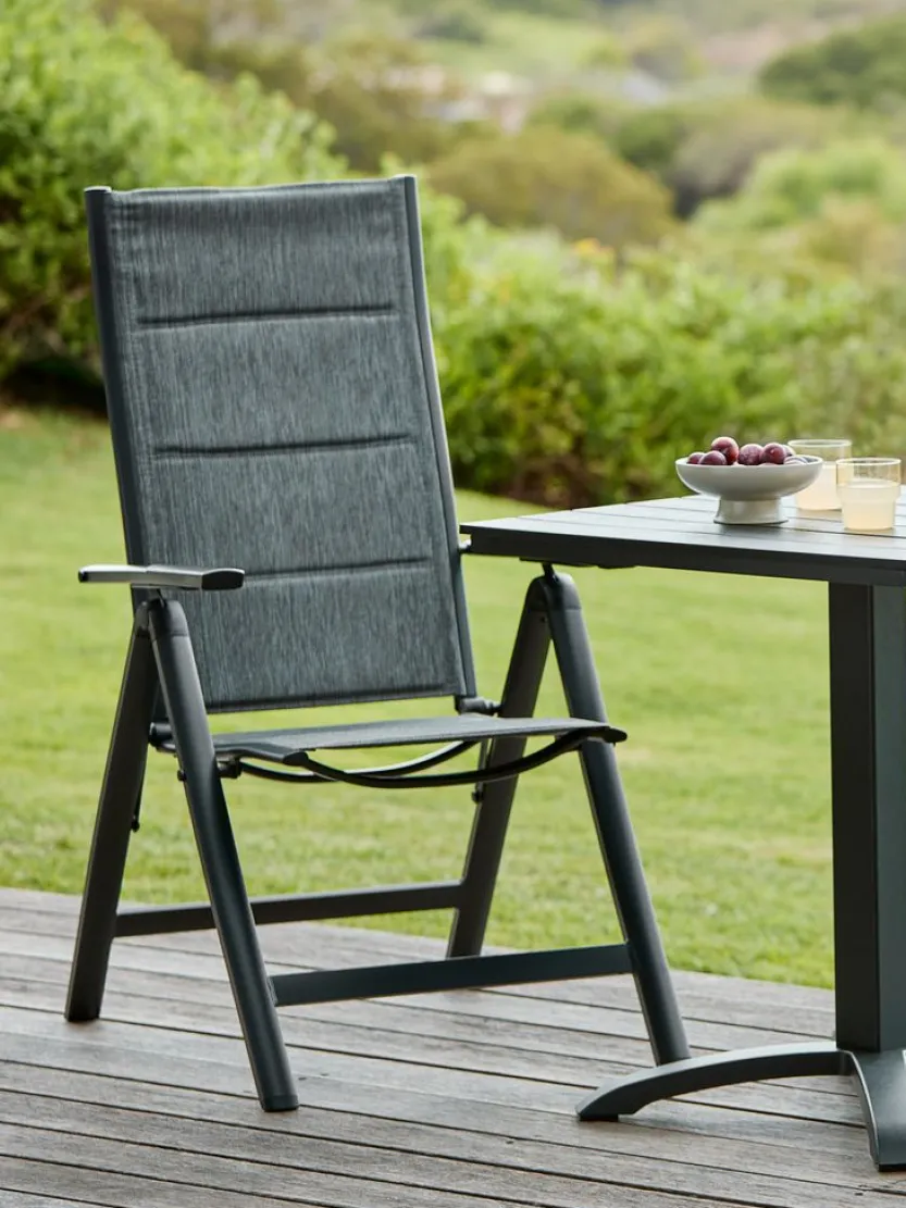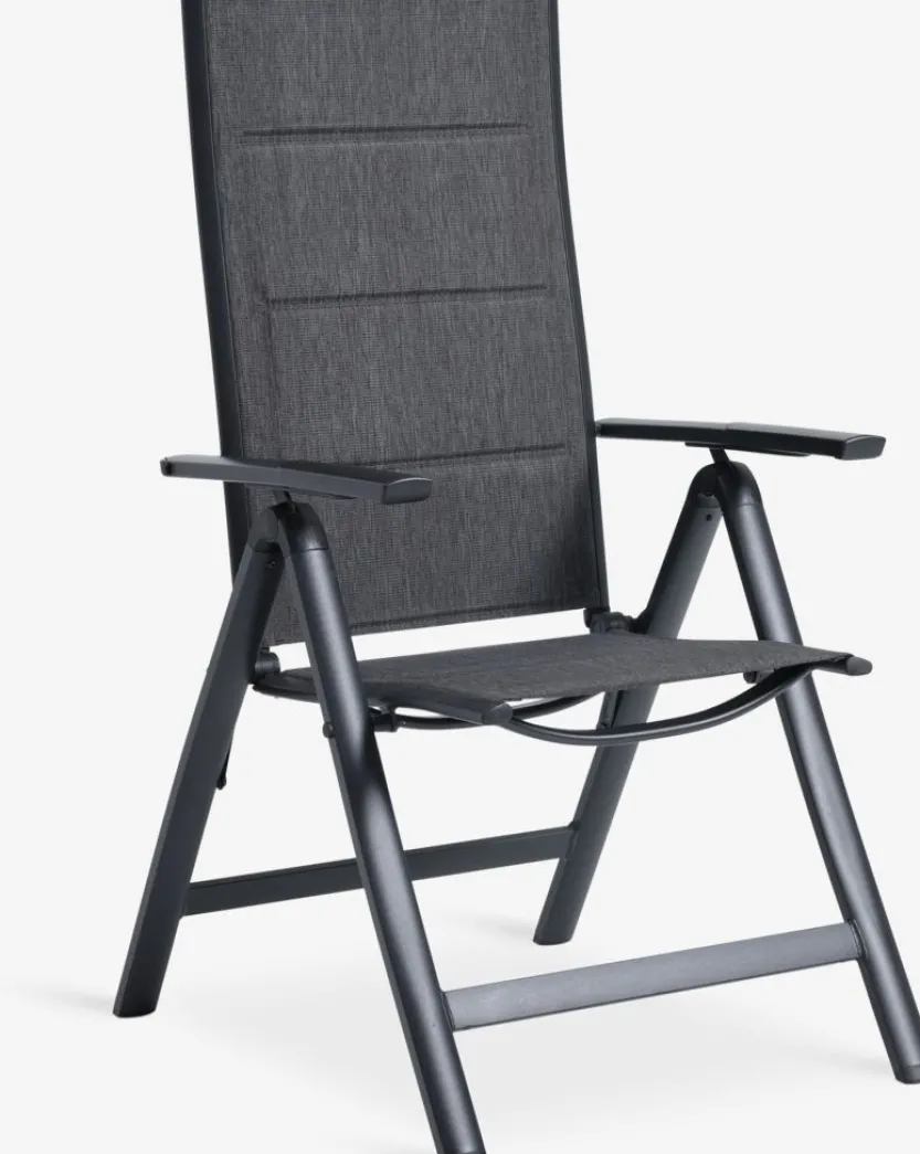Aluminium, textileen en sneldrogend schuim. 6 standen. Inklapbaar.
