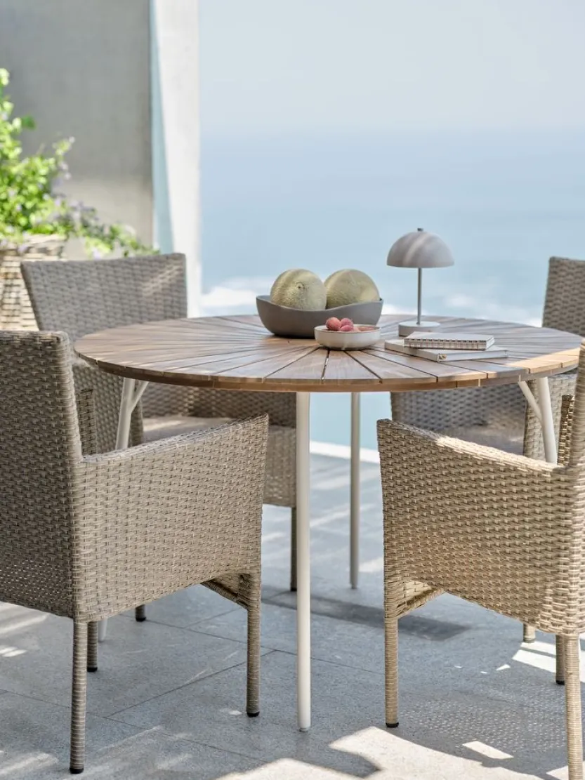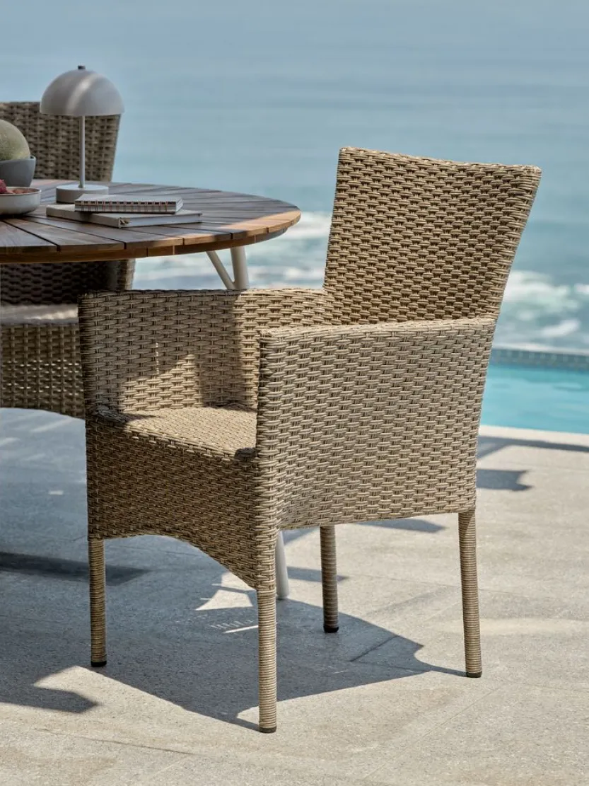 Staal en polyrotan. Stapelbaar.