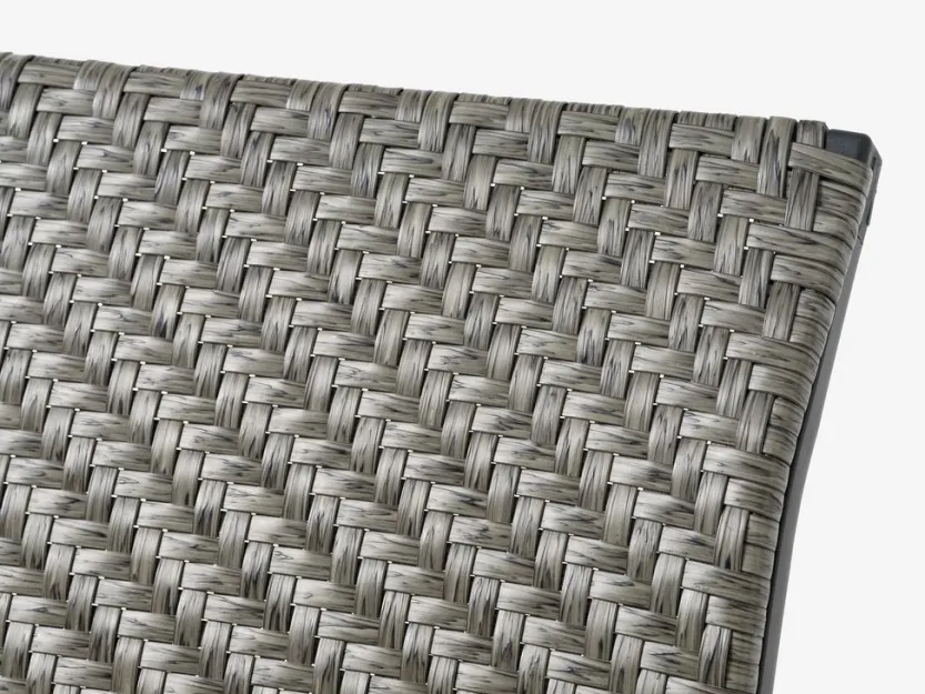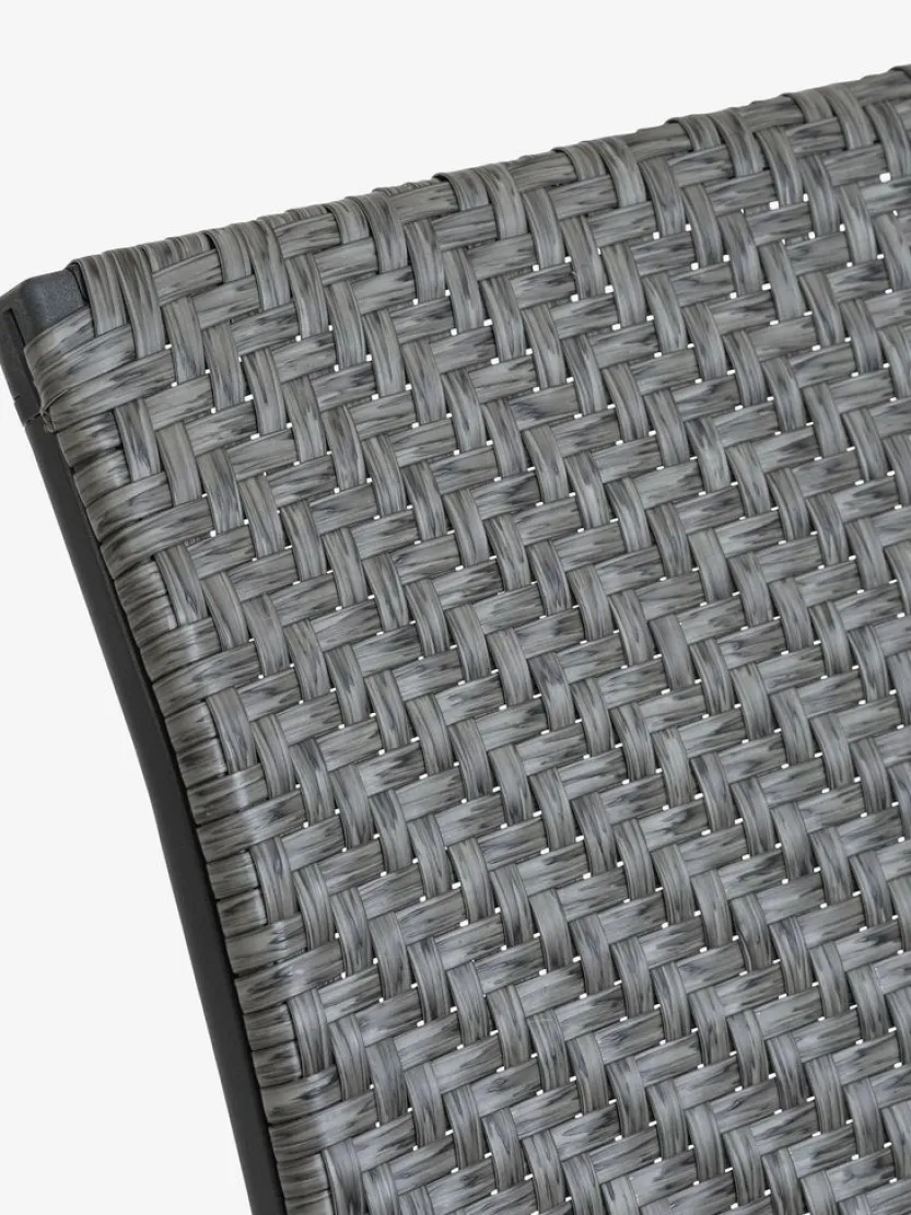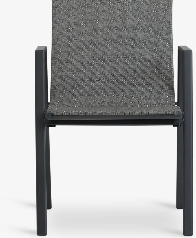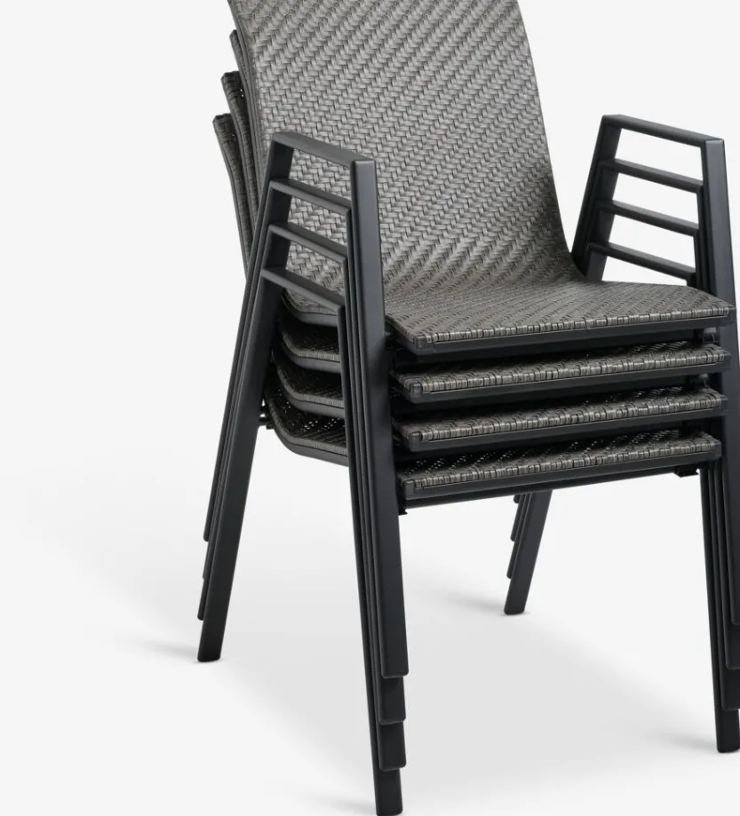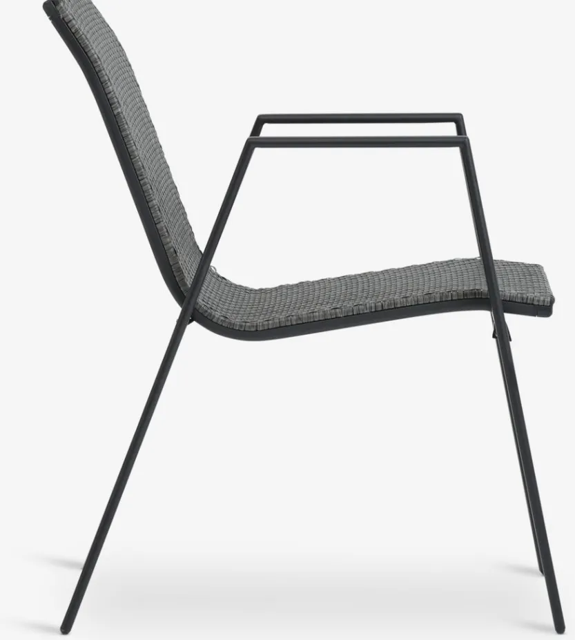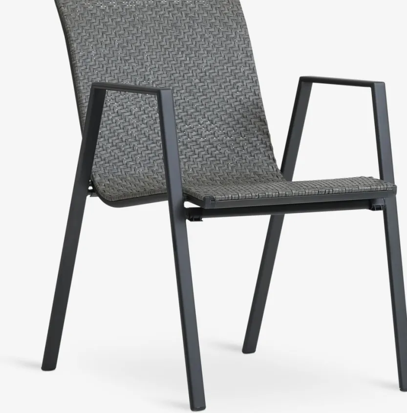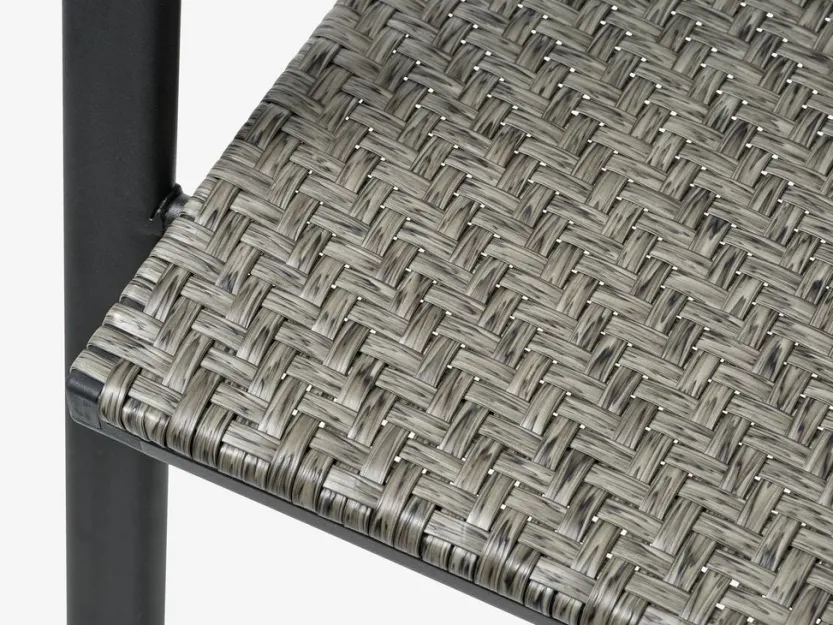 Grijze stapelstoel met een zitting van polyrotan en een frame van gepoedercoat staal. Polyrotan zorgt voor een natuurlijke vlechtwerklook, terwijl het weerbestendig en onderhoudsvrij is. De tuinstoel kan gestapeld worden voor compact opbergen.