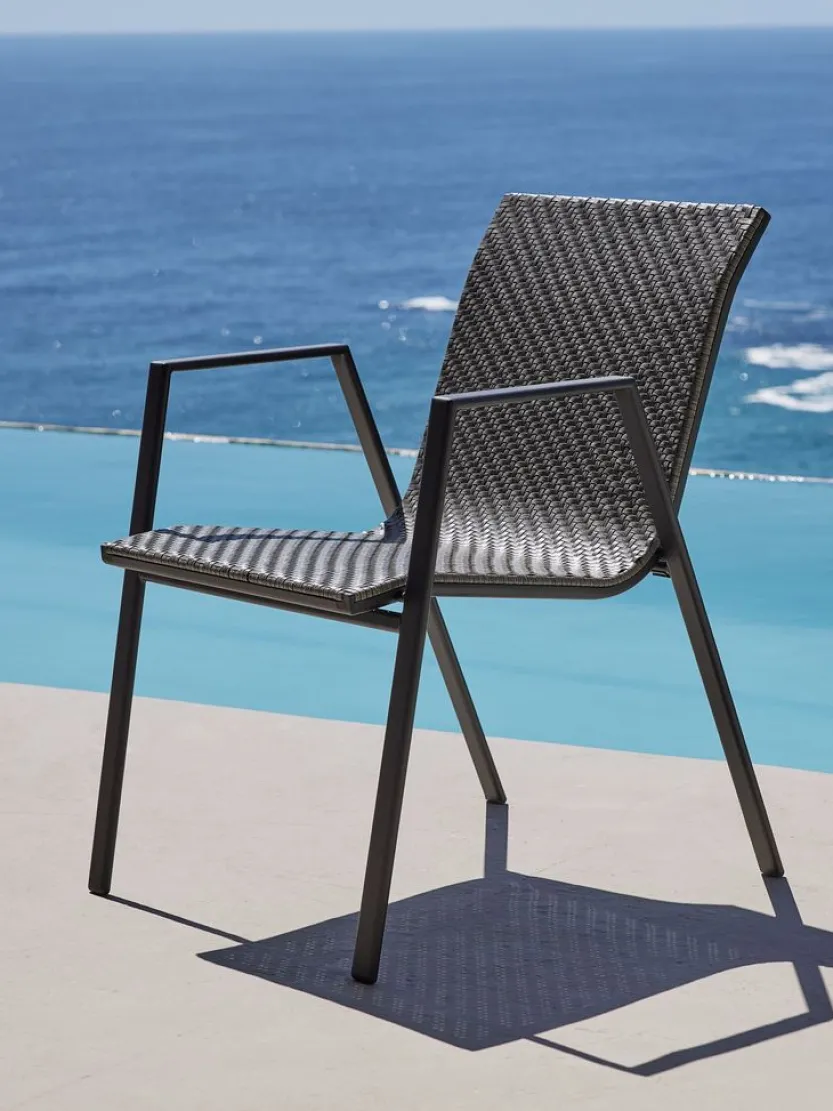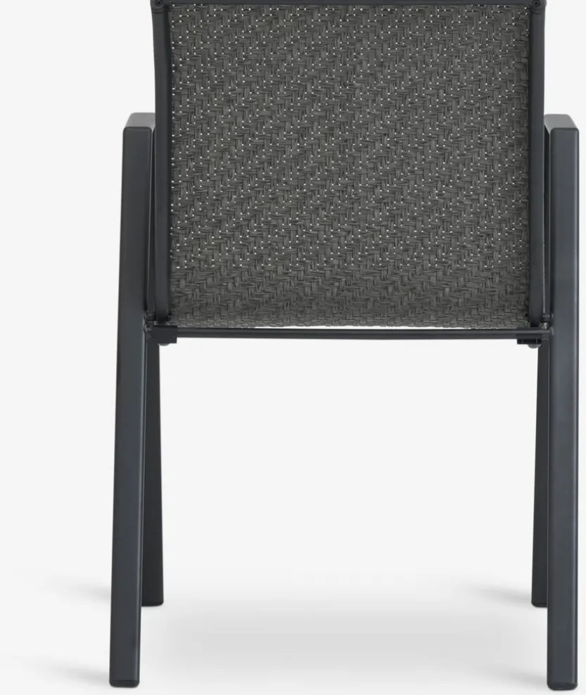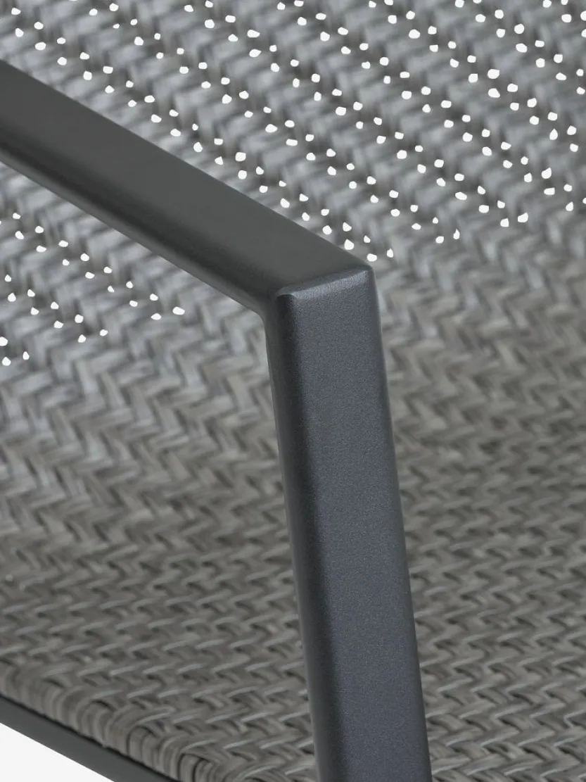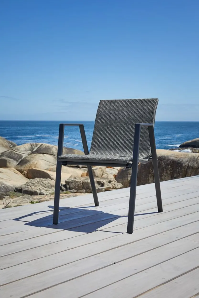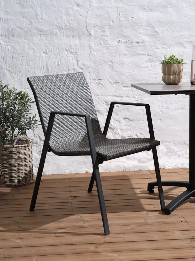 Grijze stapelstoel met een zitting van polyrotan en een frame van gepoedercoat staal. Polyrotan zorgt voor een natuurlijke vlechtwerklook, terwijl het weerbestendig en onderhoudsvrij is. De tuinstoel kan gestapeld worden voor compact opbergen.
