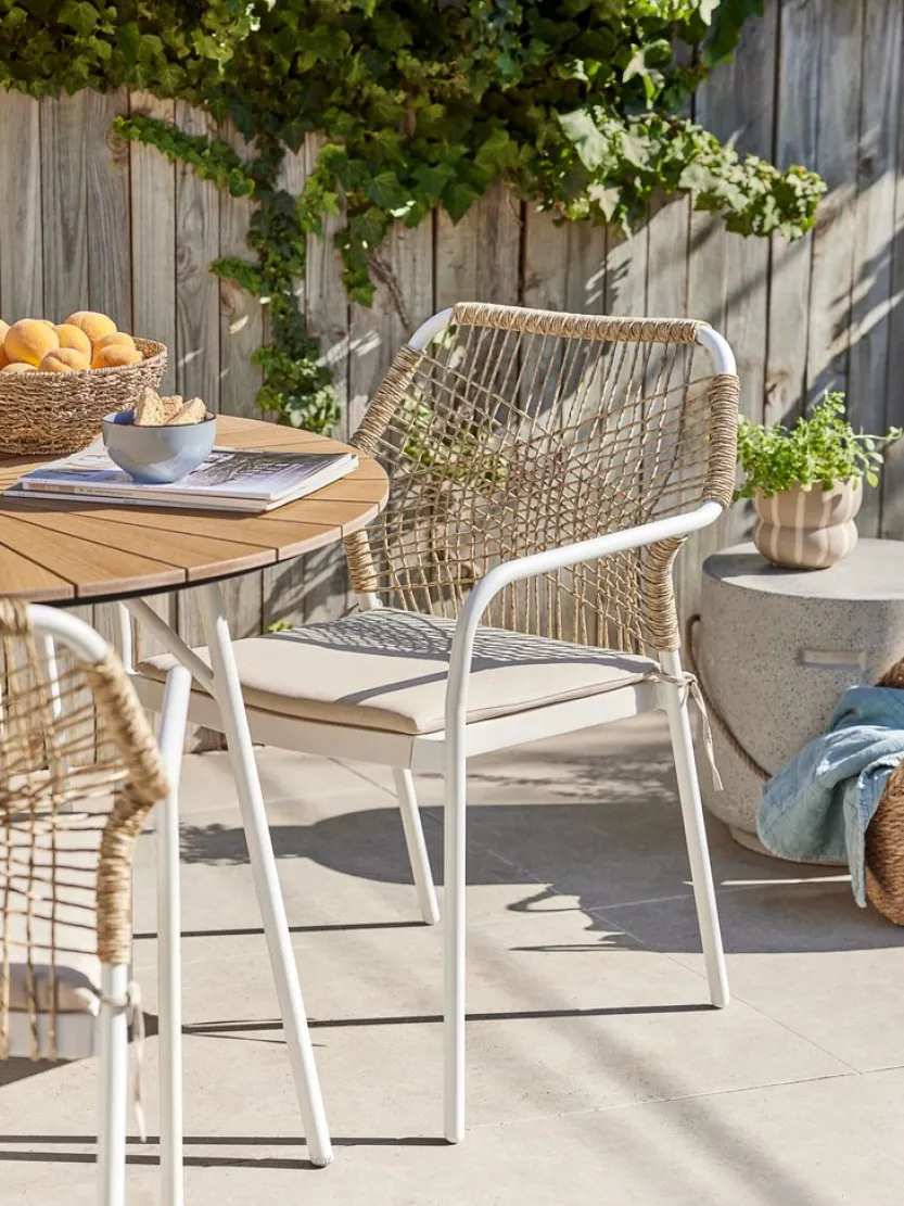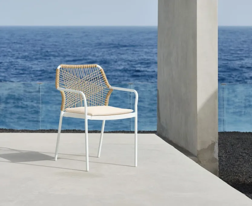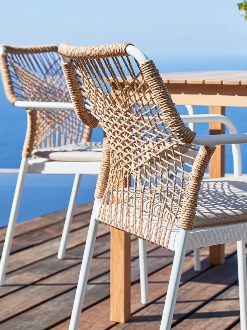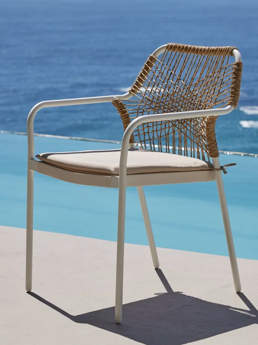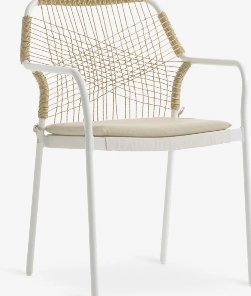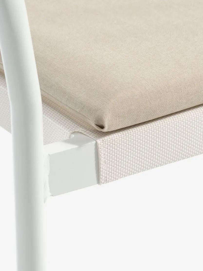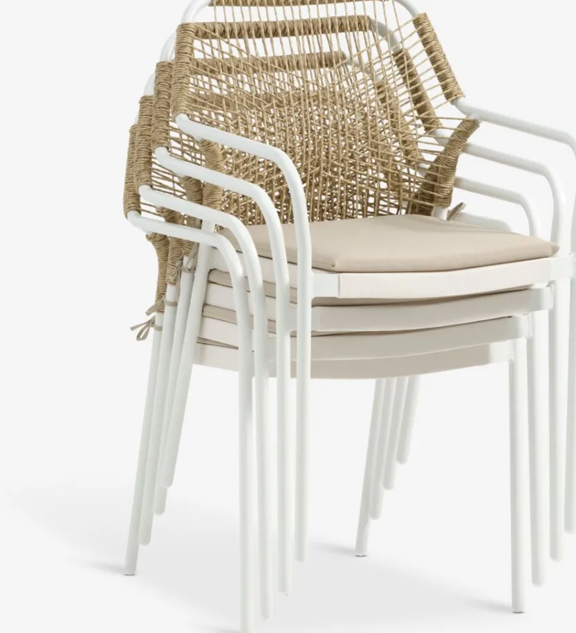 Witte stapelstoel met een zitting van textileen en een rugleuning van polyrotan. Inclusief kwaliteitskussen met duurzame hoes. Frame van aluminium met poedercoating. Textileen is een comfortabel, kleurecht materiaal dat snel droogt en gemakkelijk schoon te maken is. Polyrotan geeft een natuurlijke vlechtwerklook en is weerbestendig en onderhoudsvrij. Aluminium is een lichtgewicht en robuust materiaal dat niet roest. De tuinstoel kan gestapeld worden voor compact opbergen.