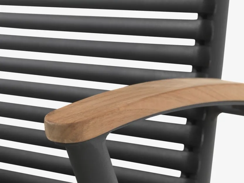 Aluminium, gerecycled massief FSC teak en UV-beschermd kunststof. Stapelbaar.