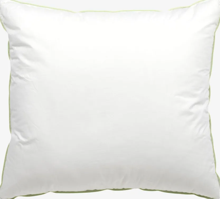 Allergievriendelijk synthetisch kussen 60×63/70 cm met unieke vulling van gesiliconiseerde synthetische dons, 800g. De zachte, lichte synthetische dons behoudt zijn volume en is gemakkelijk op te schudden. De zachte tijk van 100% cambric katoen heeft een chemicaliënvrije anti-huisstofmijt behandeling gehad, dit zorgt ervoor dat het binnendringen van huisstofmijt wordt verminderd. Wasbaar op 60°C. Incl. opbergtas.