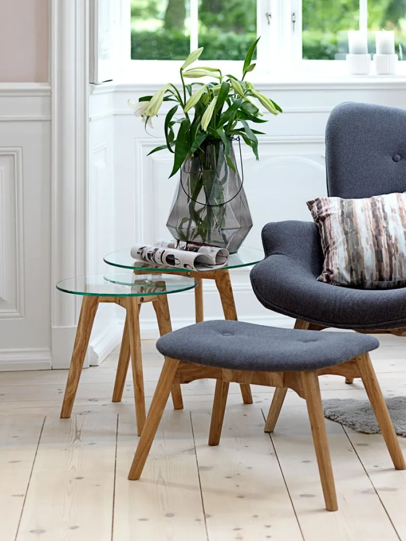 Massief eiken en gehard glas. 2 stuks. Ø50/40 x H45/40 cm