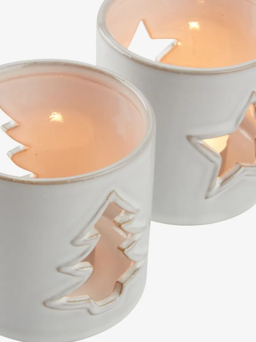 Deze set van twee witte theelichthouders van steengoed, is perfect voor de feestdagen. Elk houdertje heeft een uitgesneden ontwerp; een ster en een kerstboom, waardoor het licht van de kaars sfeervol naar buiten straalt. Deze decoratieve theelichthouders voegen een warme en gezellige touch toe aan elk interieur. Ø8 x H8 cm