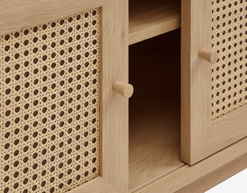 Massief hout, polyrotan en deco fineer. Met schuifdeuren. B160 x H50 x D40 cm