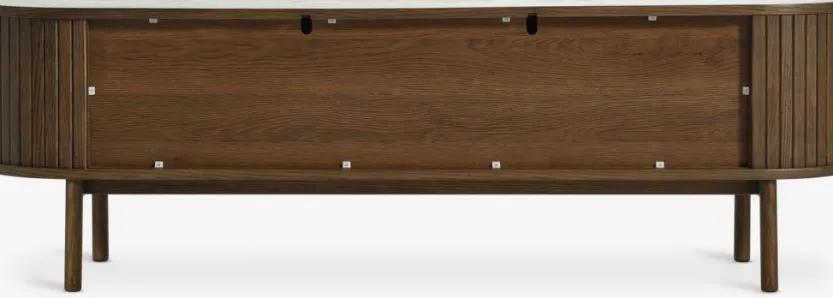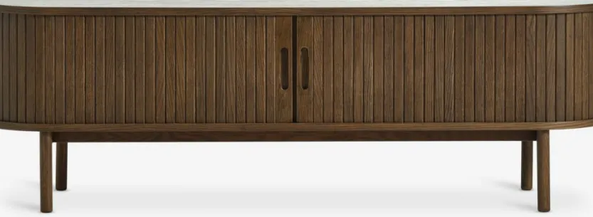 Massief eiken, eiken fineer en deco fineer. Met 2 tambour schuifdeuren. B160 x H50 x D40 cm
