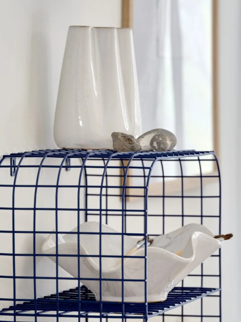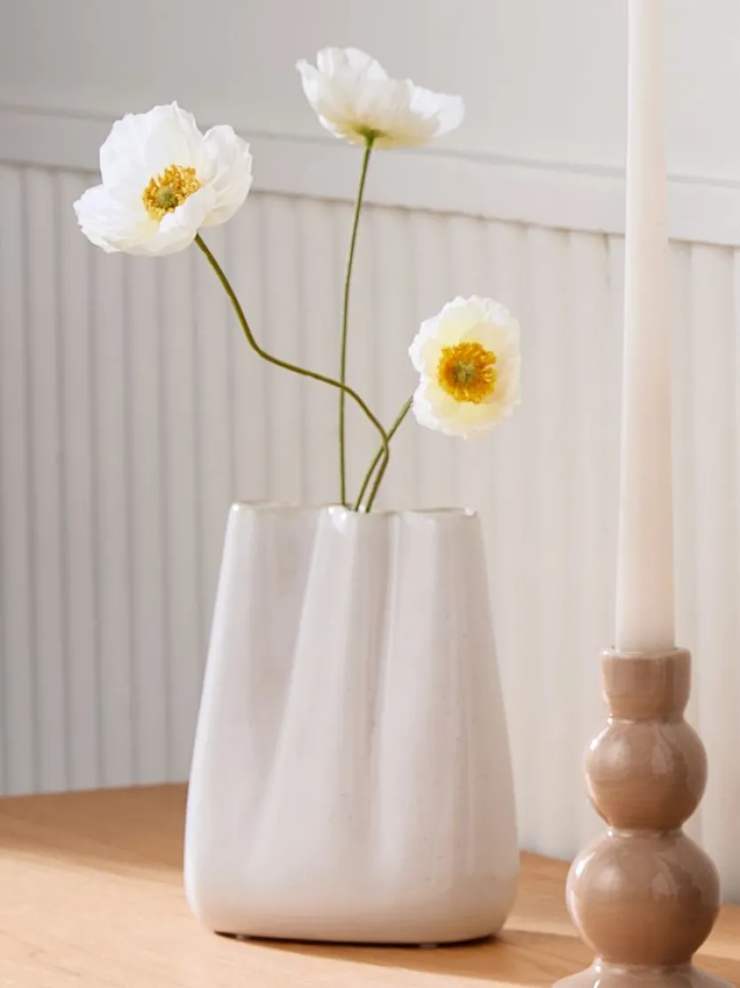 Witte vaas van steengoed met een modern en strak ontwerp. De vaas heeft een gladde afwerking en een subtiele glans, wat zorgt voor een elegante uitstraling. Perfect om een stijlvol accent toe te voegen aan je interieur. B13 x L8 x H17 cm