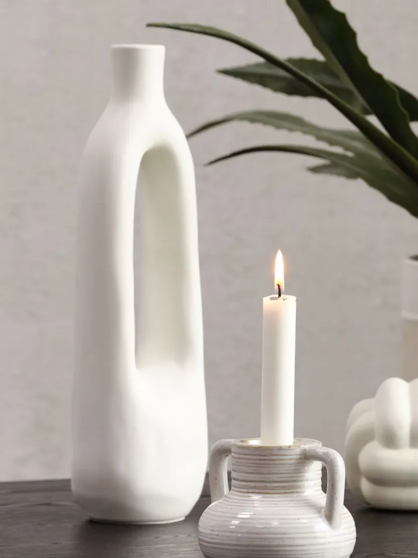 Witte vaas van steengoed met een uniek open ontwerp. Deze elegante vaas heeft een slanke, langwerpige vorm met een opvallende uitsparing in het midden, wat zorgt voor een moderne en stijlvolle uitstraling. Perfect voor het tentoonstellen van enkele bloemen of als zelfstandig decoratief object. B10 x L8 x H34 cm