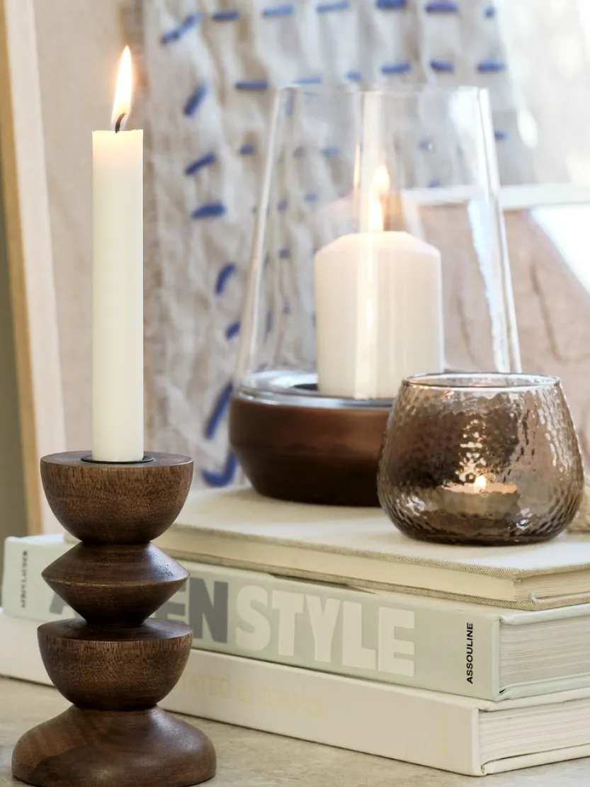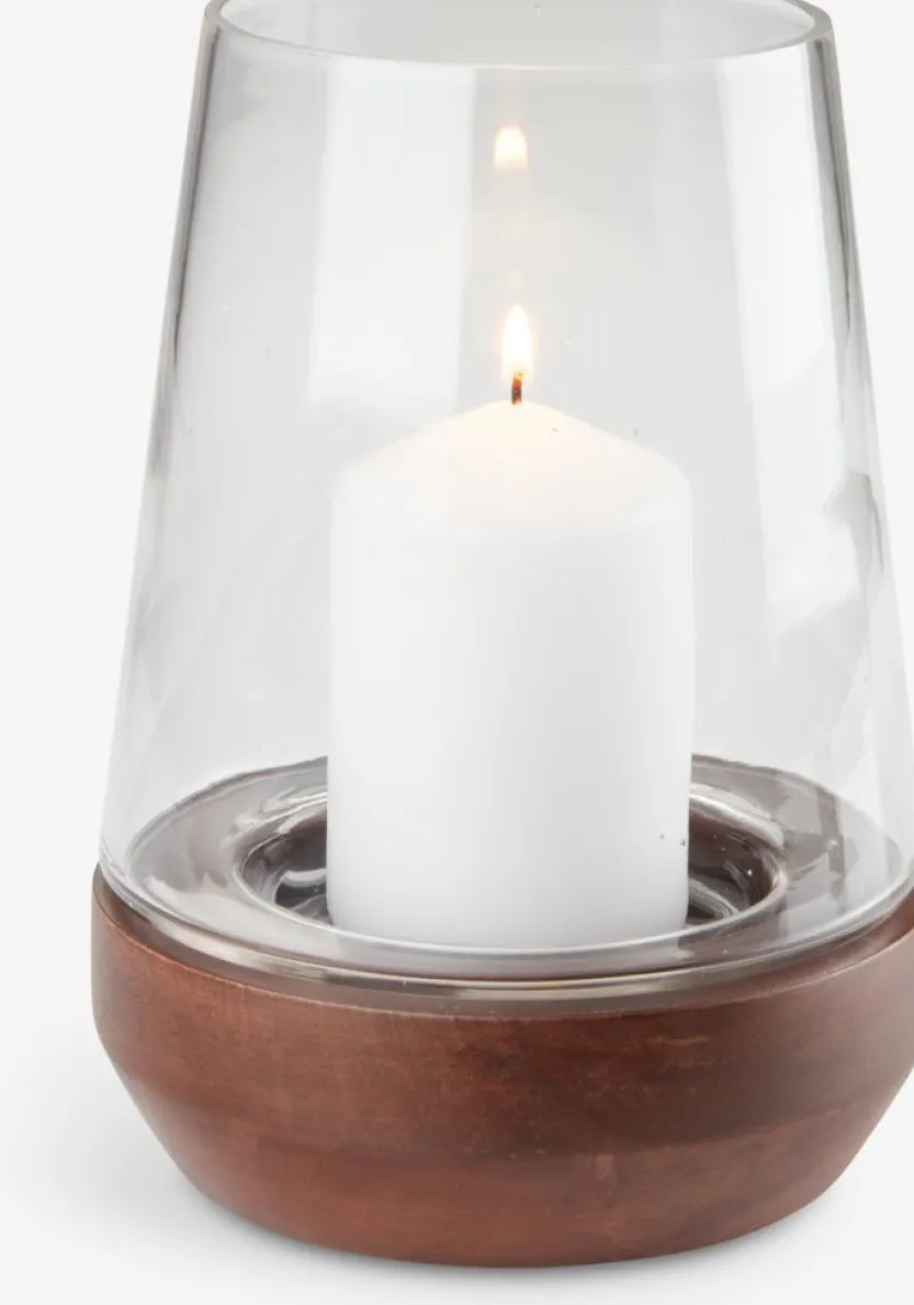 Windlicht van helder glas met een onderkant van walnotenhout. De combinatie van transparant glas en natuurlijk hout creëert een harmonieuze look die past bij verschillende interieurstijlen. Ø15 x H21 cm