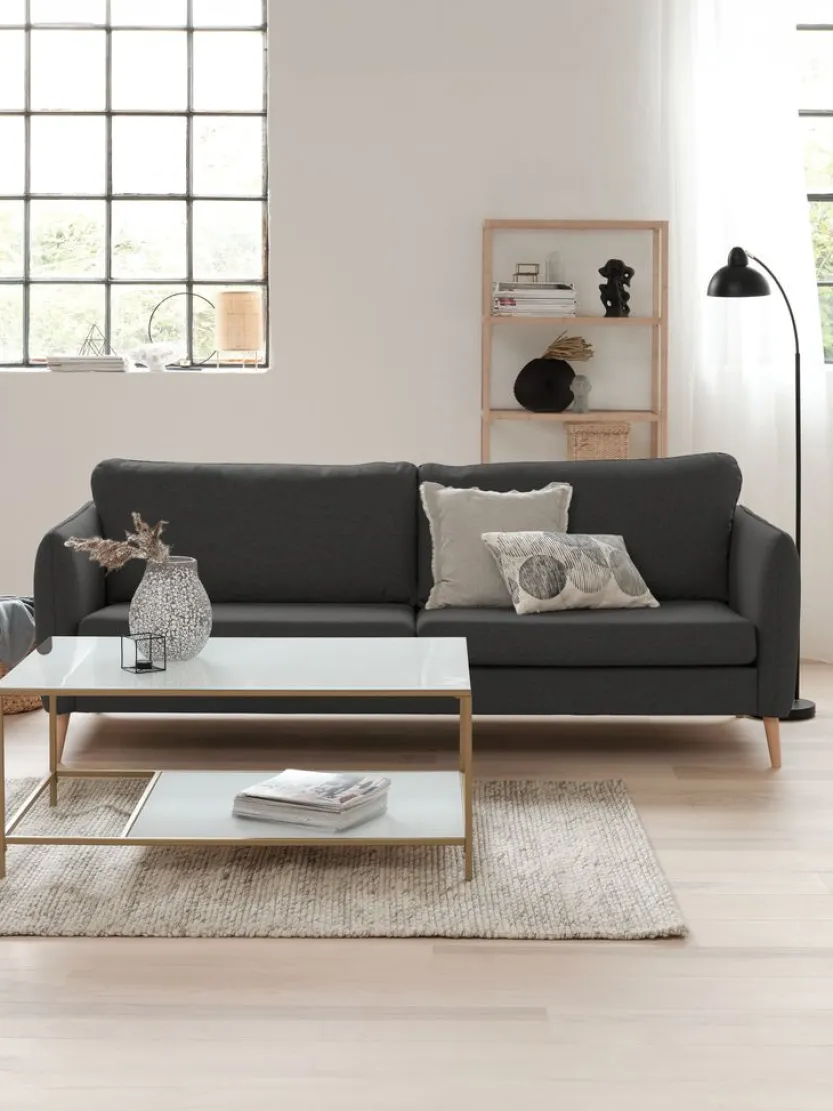 3-zits bank van stof. Zit- en rugkussens van schuim. Poten van massief beuken. Kan worden gespiegeld. B222 x H85 x D84 cm