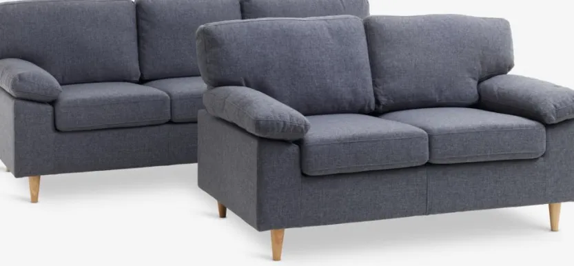 3-zitsbank van stof. Zitkussen met pocketveren en schuimvulling. Rugkussen van schuim. Poten van massief hout. B210 x H85 x D84 cm