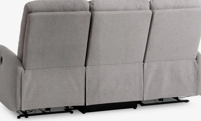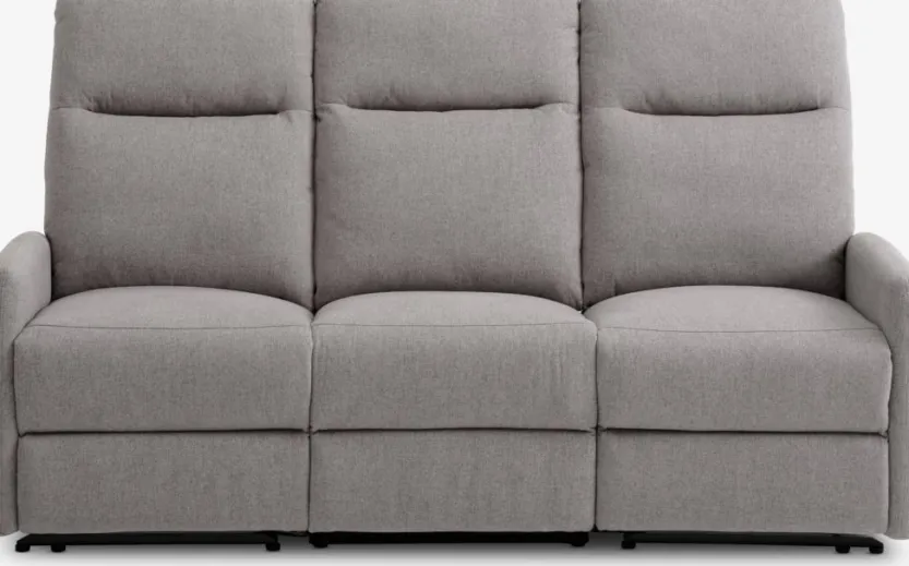 3-zitsbank in stof. Zitkussen met pocketveren en schuimvulling. Rugkussen van schuim. Basis uit staal. De twee buitenste stoelen hebben een elektrisch bediend traploos kantelmechanisme en ingebouwde voetensteun. B195 x H110 x D97 cm