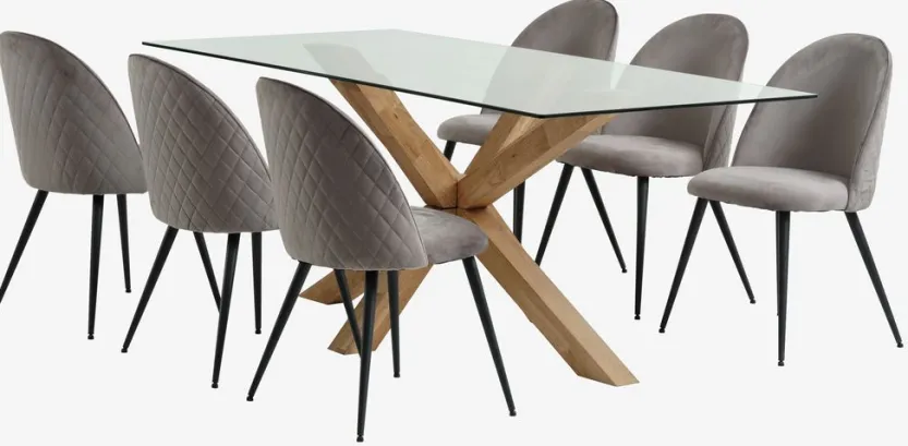 Tafel: Massief eiken en gehard glas. B90 x L190 x H75 cm. Stoel: Fluwelen stof en staal.