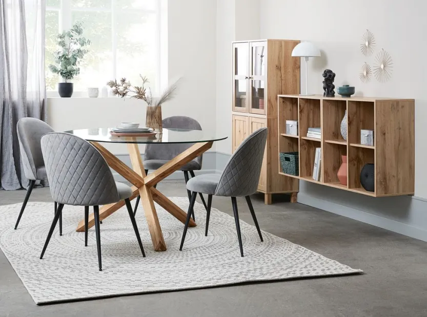 AGERBY Ø119 tafel eiken + 4 KOKKEDAL stoelen fluweel grijs