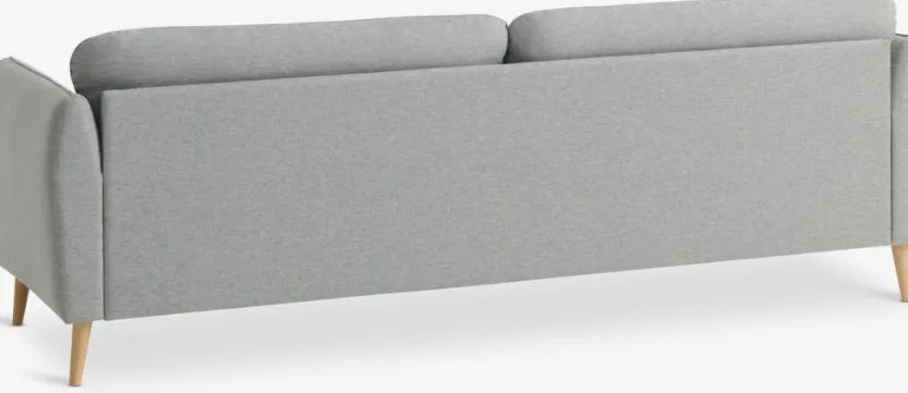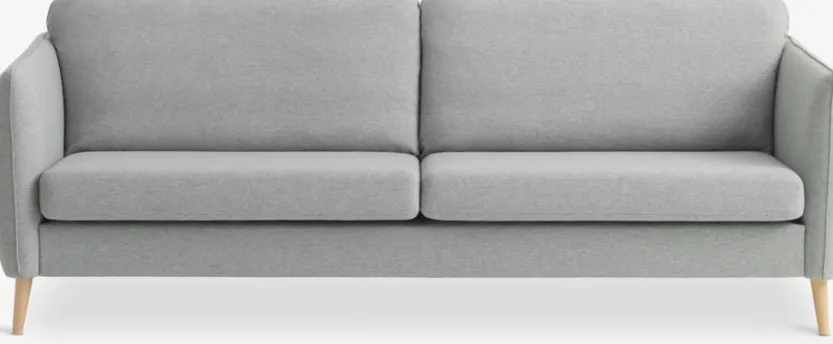 3-zits bank van stof. Zit- en rugkussens van schuim. Poten van massief beuken. B222 x H85 x D84 cm