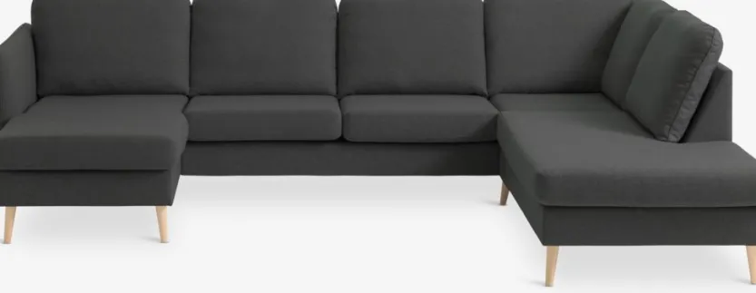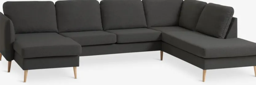 6-zits hoekbank van stof. Zit- en rugkussens van schuim. Poten van massief beuken. Kan niet worden gespiegeld. B294 x H82 x D82/137/201 cm