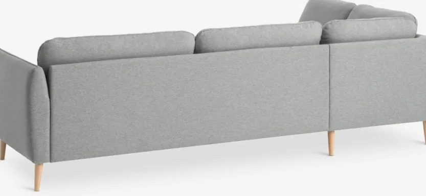 4-zits hoekbank van stof. Zit- en rugkussens van schuim. Poten van massief beuken. Kan niet worden gespiegeld. B273 x H82 x D82/201 cm
