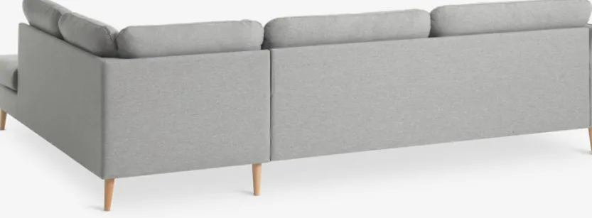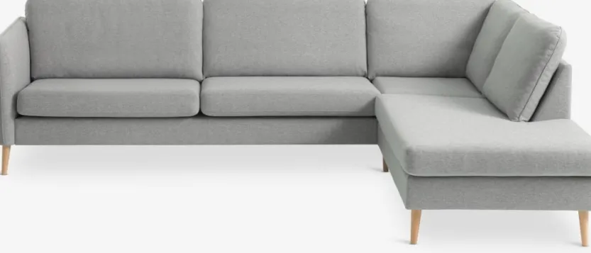 4-zits hoekbank van stof. Zit- en rugkussens van schuim. Poten van massief beuken. Kan niet worden gespiegeld. B273 x H82 x D82/201 cm