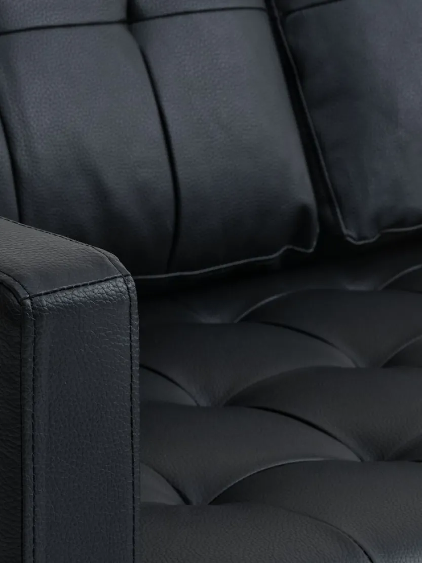 3-zitsbank in kunstleer. Zit- en rugkussens in schuim. Poten uit massief hout. Kan worden gespiegeld. B216 x H78 x D83/149 cm