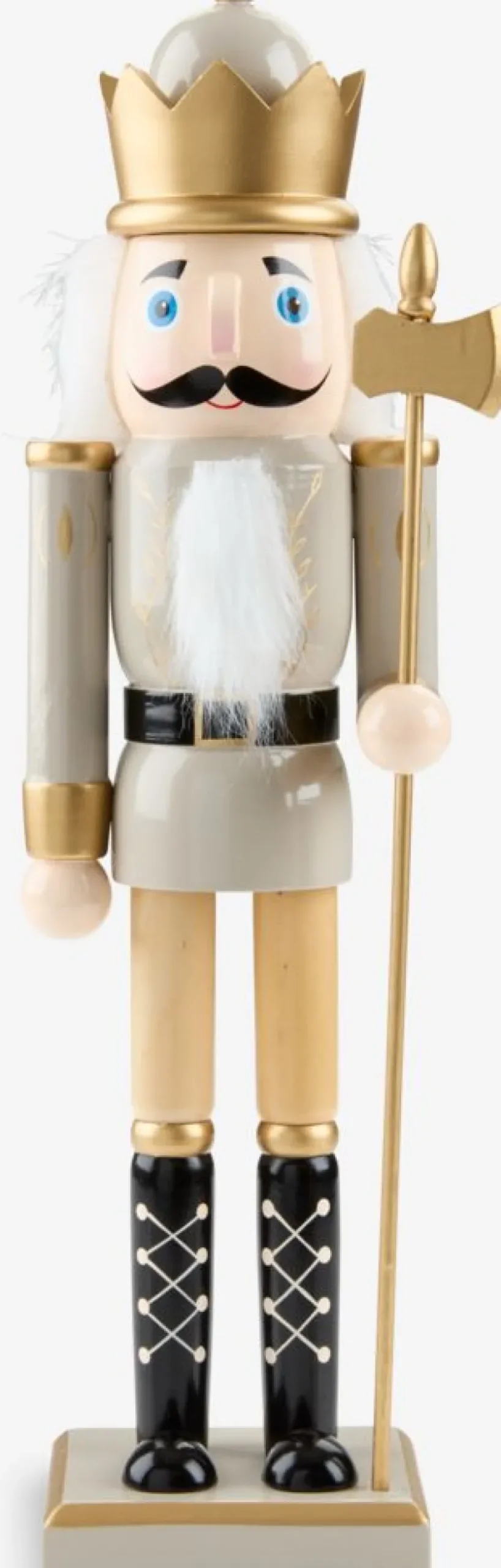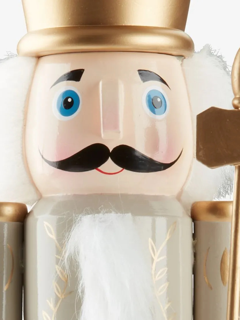 Grijs kerstbeeldje in de vorm van een notenkraker. Dit decoratieve figuur heeft een klassieke uitstraling met gouden details en een kroon. De notenkraker staat stevig op een voetstuk en houdt een staf vast, waardoor het een opvallende toevoeging is aan je kerstdecoratie. B9 x L10 x H38 cm
