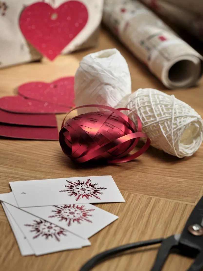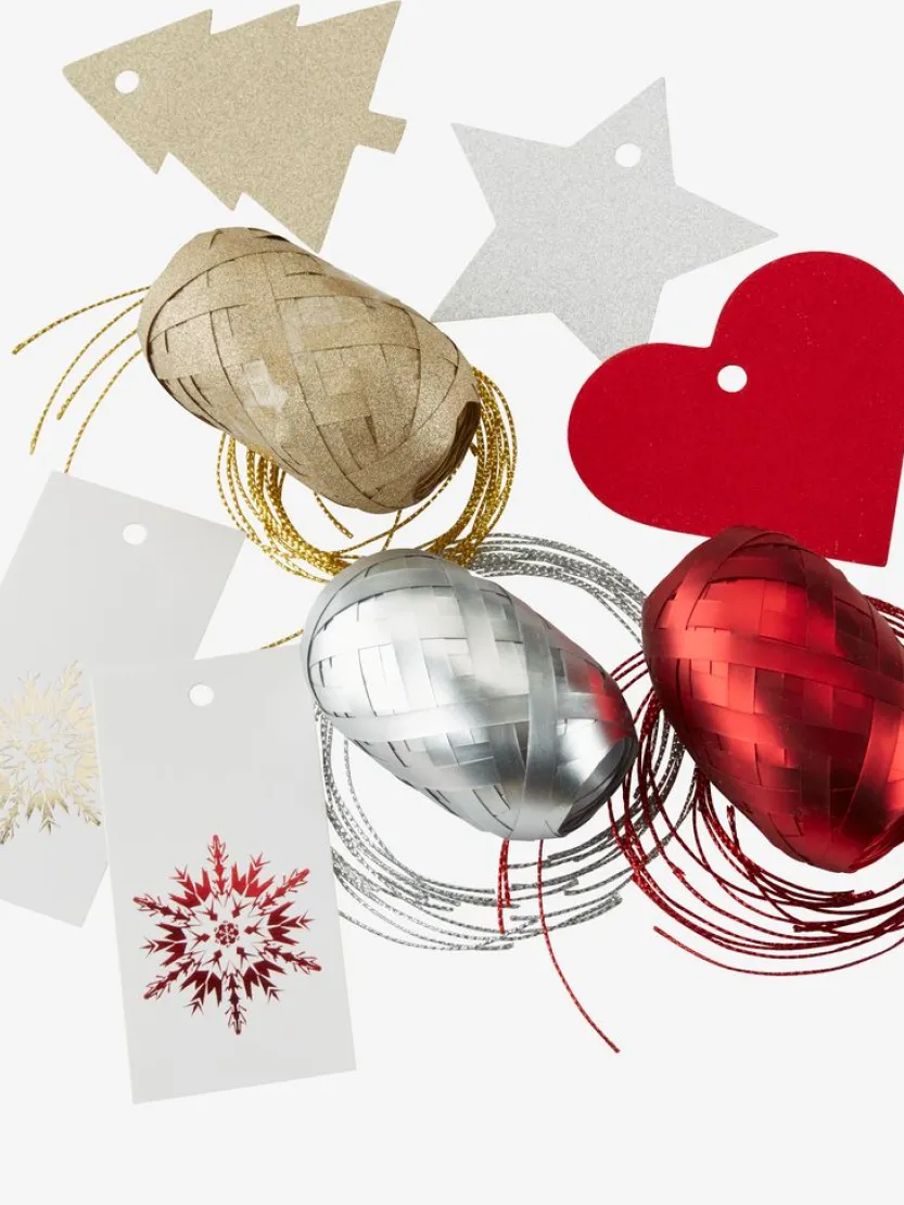 Kerstcadeauverpakking inclusief verschillende artikelen voor het inpakken van kerstcadeaus, zoals cadeaulabels en linten in goud, rood en zilver. Ideaal voor het maken van mooi ingepakte cadeaus tijdens de feestdagen.