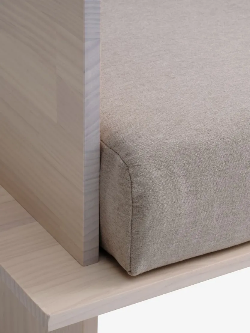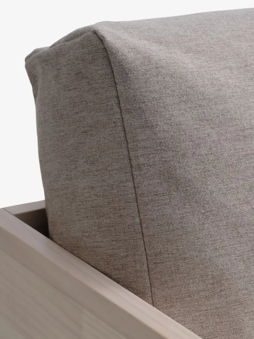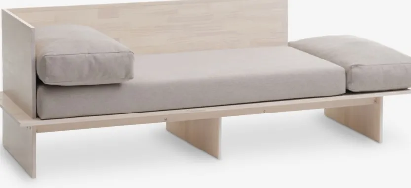 Stof. Zit- en rugkussens van schuim. Frame van massief grenen. De kussens kunnen herschikt worden om er een slaapplaats van te maken. B204 x H72 x D78 cm