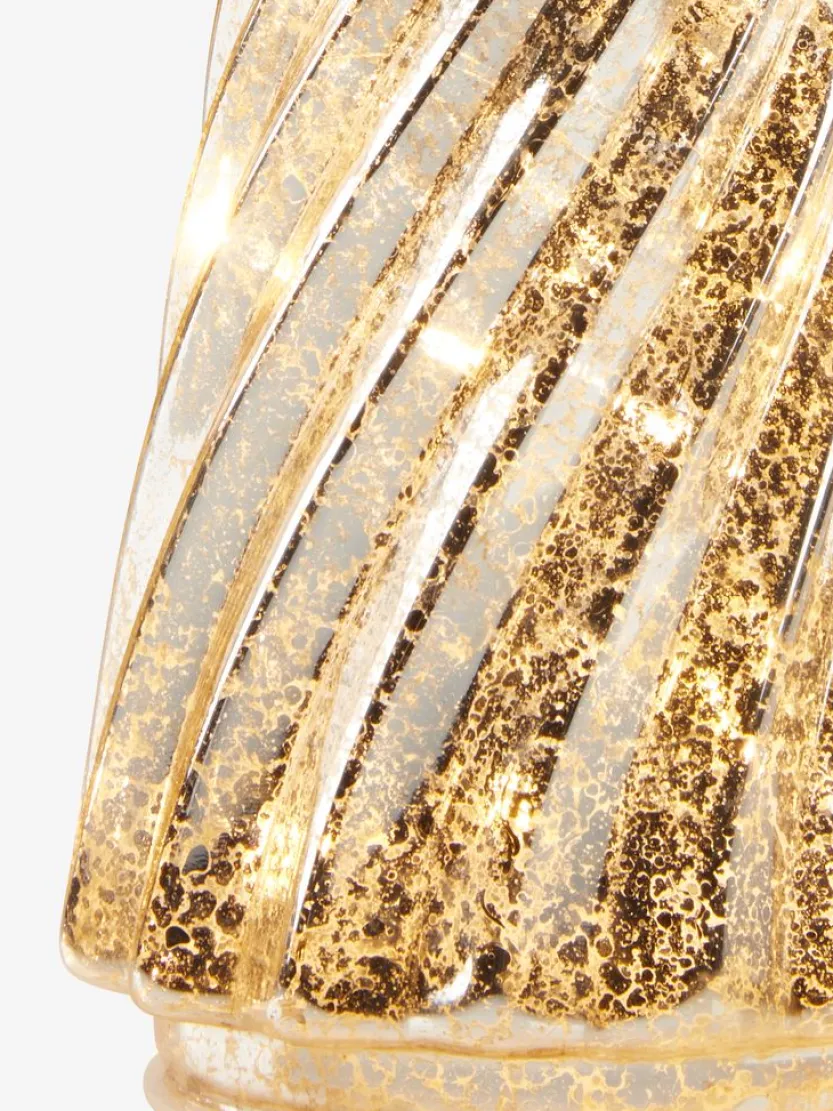 Set van twee kerstbomen in zilver en goud. Elke boom heeft een elegante vorm en is voorzien van geïntegreerde LED-lampjes die een warme gloed uitstralen. De kerstbomen hebben een timerfunctie en werken op drie AA-batterijen (niet inbegrepen). Perfect voor het creëren van een feestelijke sfeer in uw huis. Ø10 x H26 / 30 cm.
